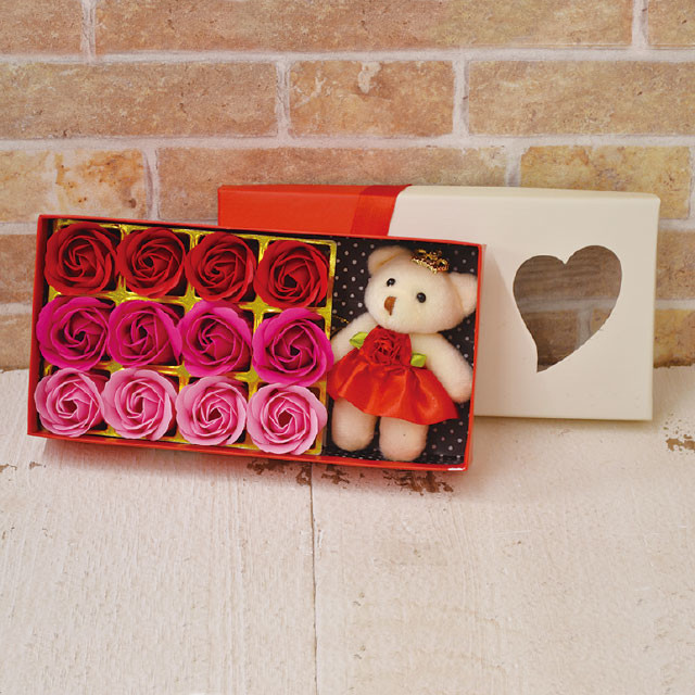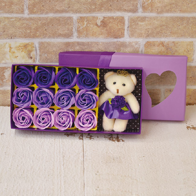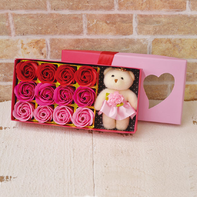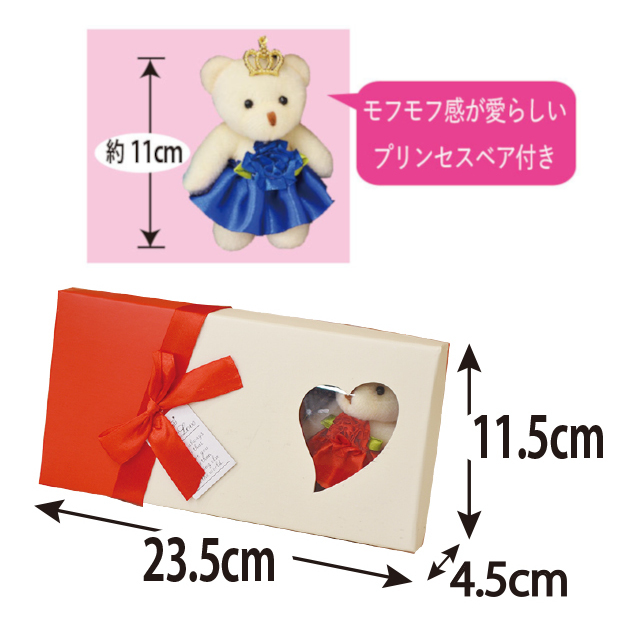 モフモフ感が愛らしいプリンセスベア付きのシャボンフラワー。手軽に贈れる可愛いプレゼント。花びら1枚1枚がせっけんの素材で出来た観賞用のお花なので、お祝いやプレゼント、ギフトにおすすめ。