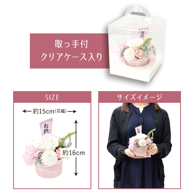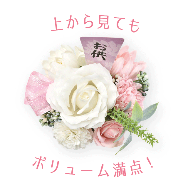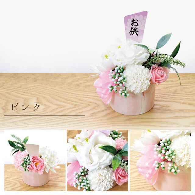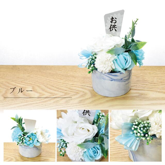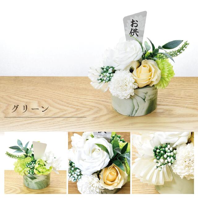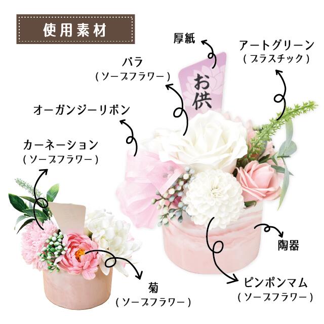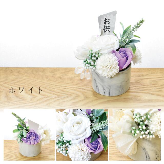 大理石調の花器とリボンが上品なお供えシャボンフラワー。コンパクトサイズなのでちょっとしたスペースがあればお供えできます。花びら1枚1枚がせっけんの素材で出来た観賞用のお花です。