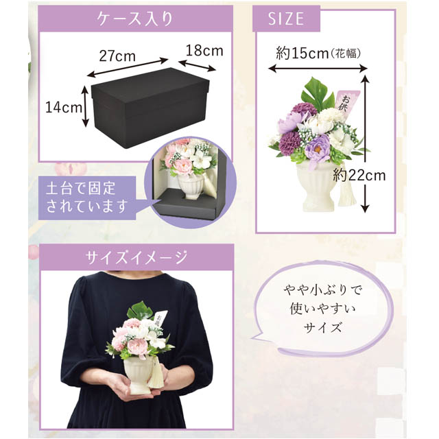 置き場所を選ばない丁度いいサイズのシャボンフラワーミニ仏花。コンパクトサイズなのでちょっとしたスペースがあればお供えできます。花びら1枚1枚がせっけんの素材で出来た観賞用のお花です。