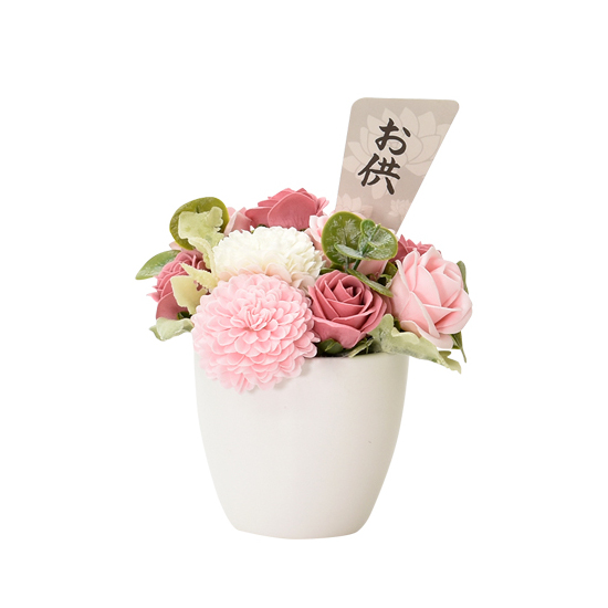 ピンクのアレンジメントと、桜の香りの線香セットにしたフューネラルアレンジ。