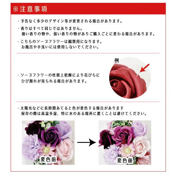 ソープフラワーとは、花びらを石鹸素材でつくったほのかに石鹸アロマ香るギフトにぴったりなお花です。 生花と違いお手入れ不要で、枯れることなく美しさをずっとキープできることもシャボンフラワーの大きな魅力です。