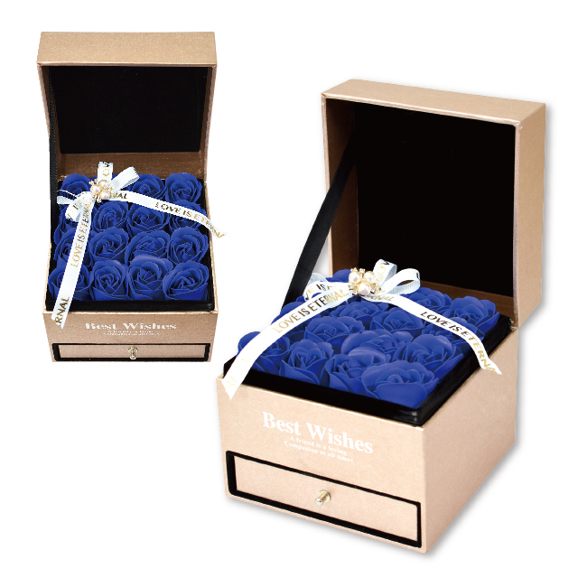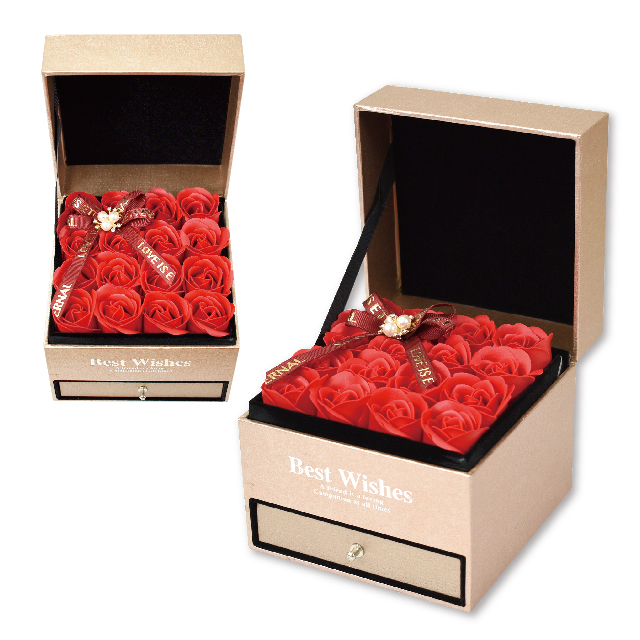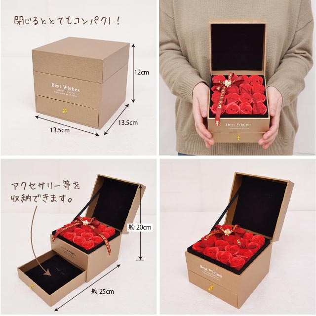 小物入れやジュエリー入れに使えるボックスに鮮やかな薔薇を詰め込みました。コンパクトサイズなので魅せる収納にも使えます。花びら1枚1枚がせっけんの素材で出来た観賞用のお花です。