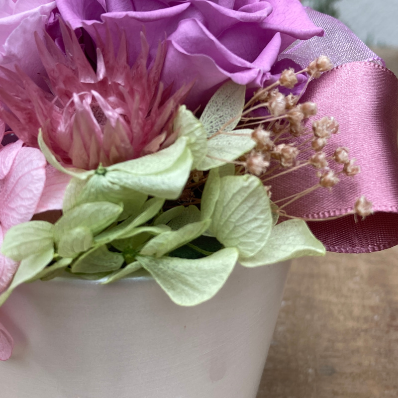 プリザーブドフラワーと可愛いホワイト花器を組み合わせたアレンジメント。