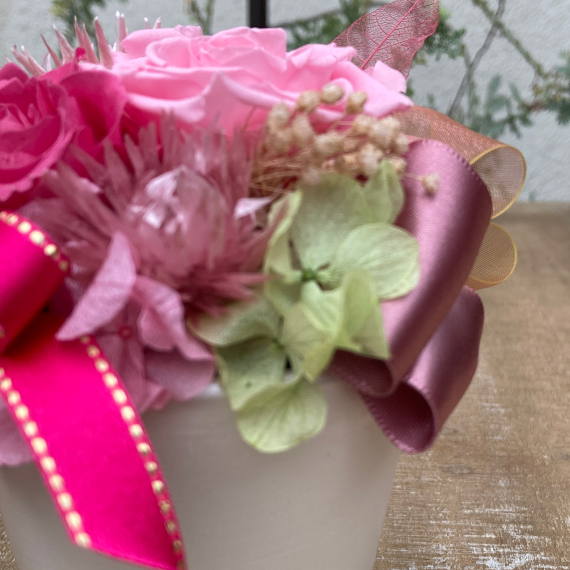 プリザーブドフラワーと可愛いホワイト花器を組み合わせたアレンジメント。