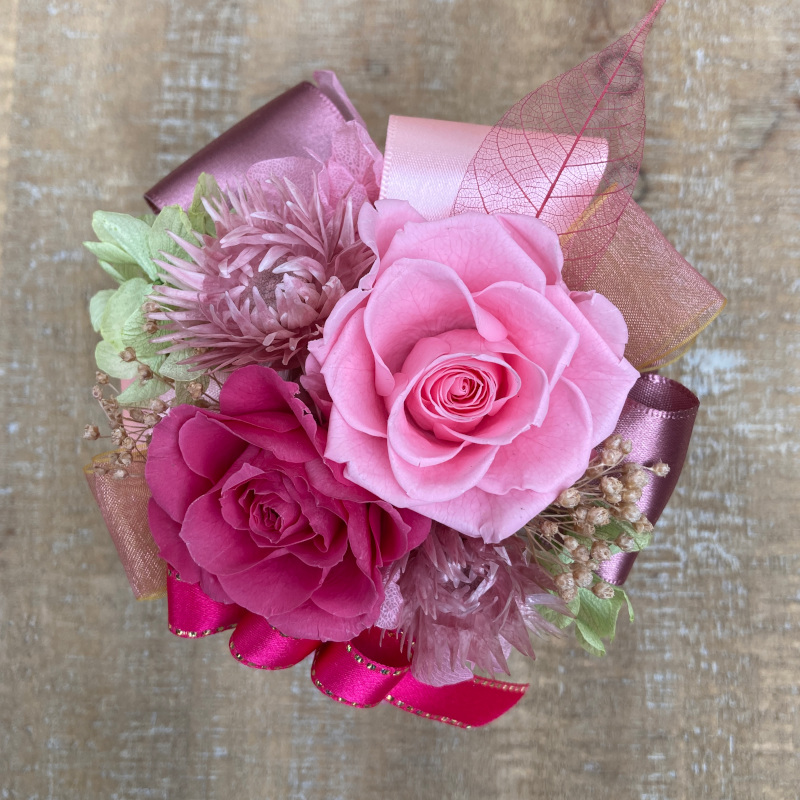 エレガントなローズに大きなリボンをアクセントにしました。ボリュームがあり華やかな印象に仕上げてあります。
