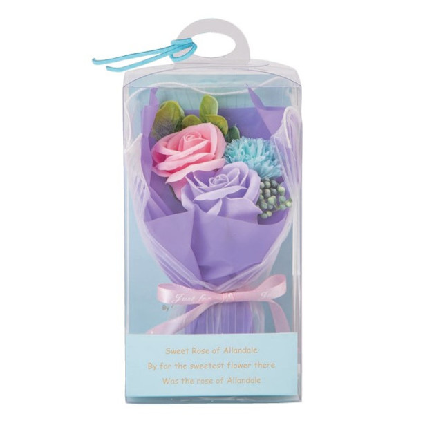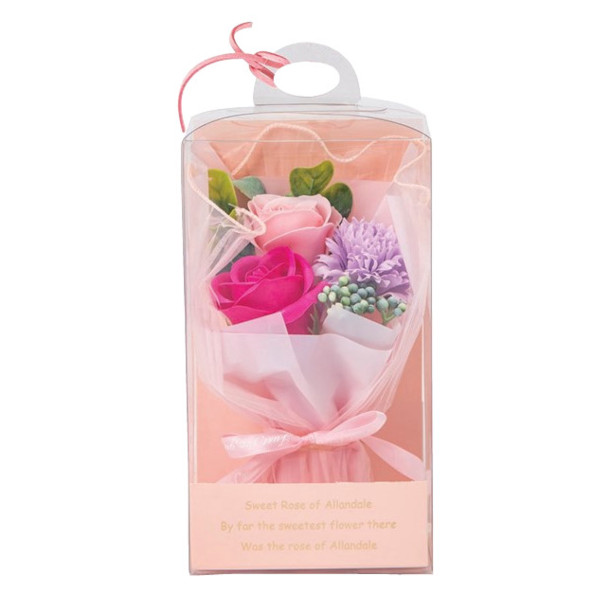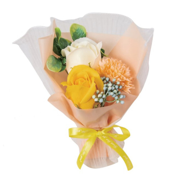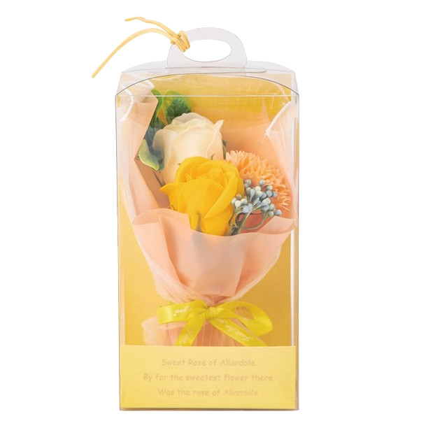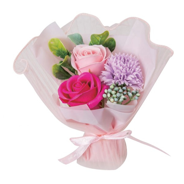 小さいサイズながらもしっかりアレンジメントされたミニブーケ。花びら1枚1枚がせっけんの素材で出来た観賞用のお花です。ケース入りなのでそのまま飾ってもカワイイです。イベント時の贈り物や、ギフトのちょい足しにも使えます。