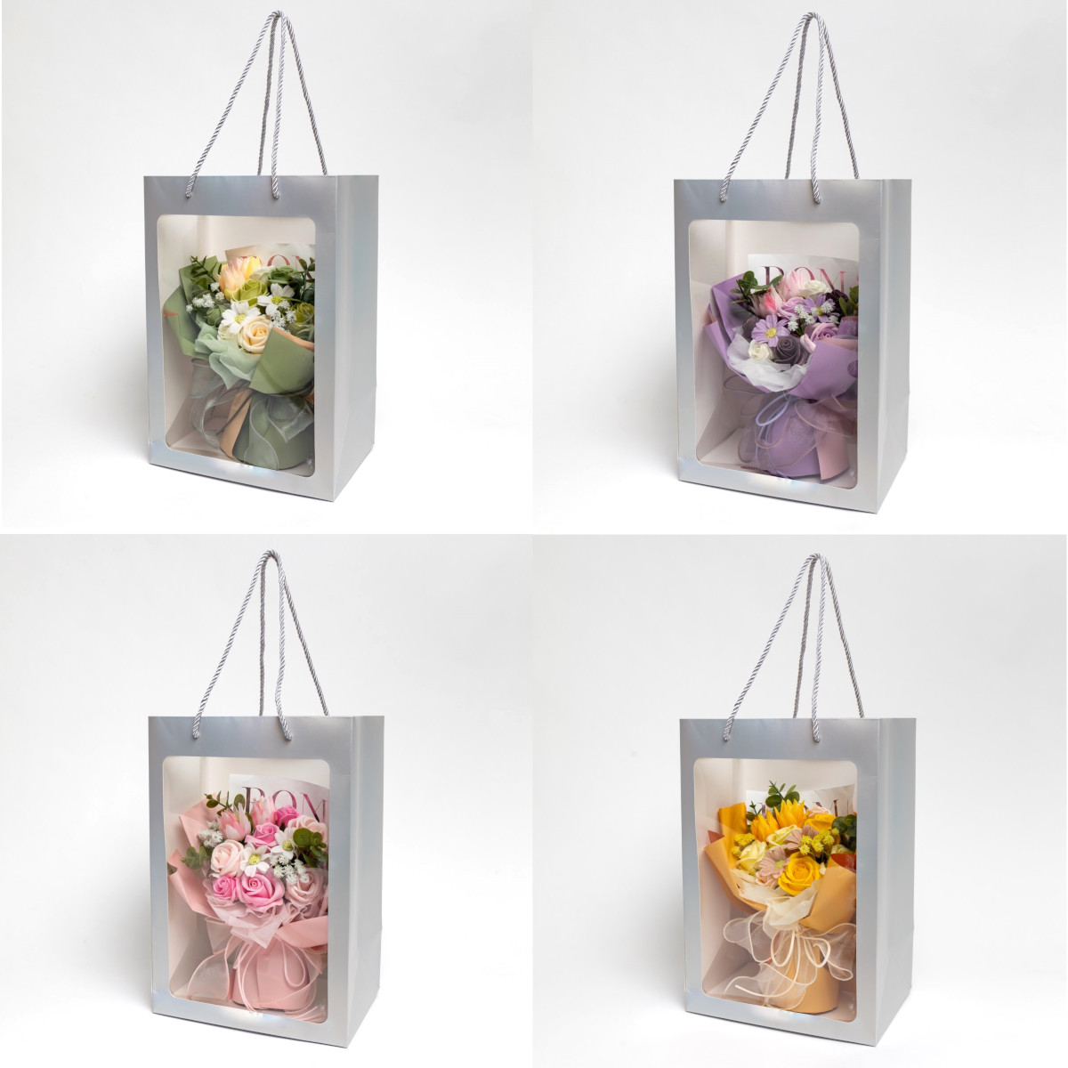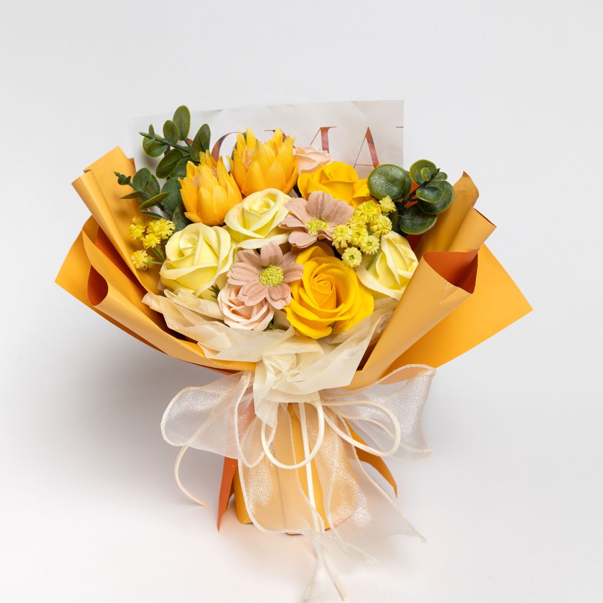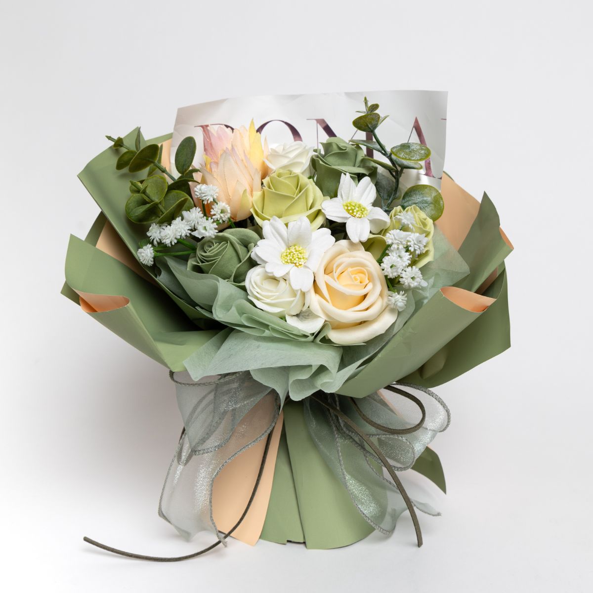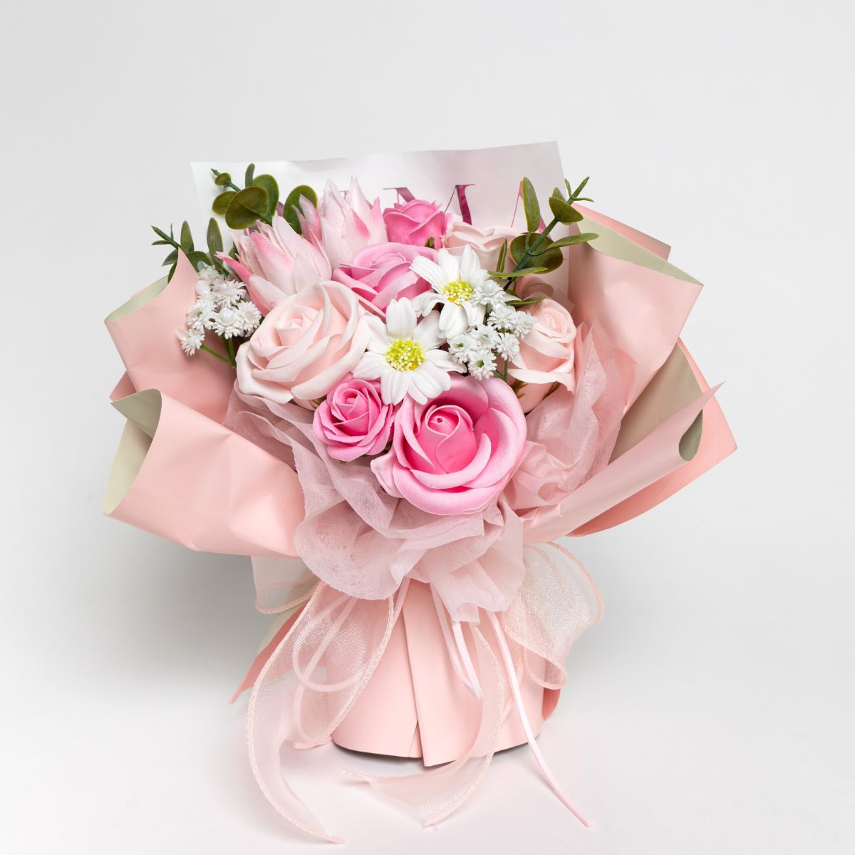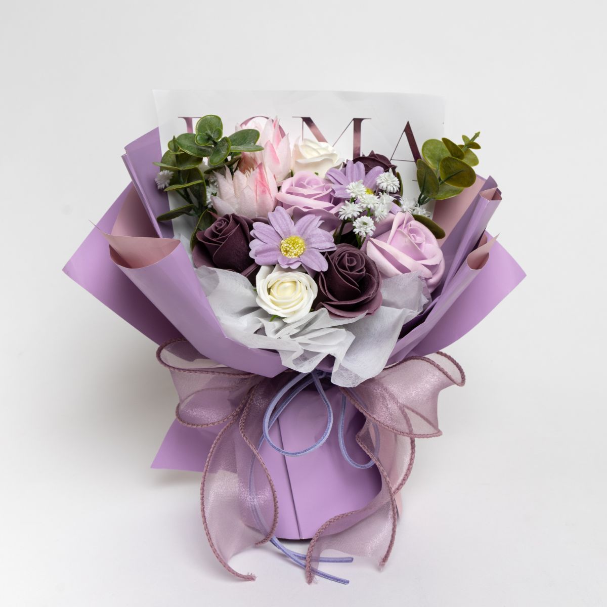 その名の通りロマンチックな雰囲気に仕上げたソープフラワーの花束。華やかで可愛い色合いのアレンジメントになります。石鹼素材で作られた観賞用のお花になるので、綺麗な状態で長く楽しめます。いつもの空間がパッと明るくオシャレに。軽くて壊れにくいのでお子様やペットのいるご家庭でも気軽に飾って頂けます。