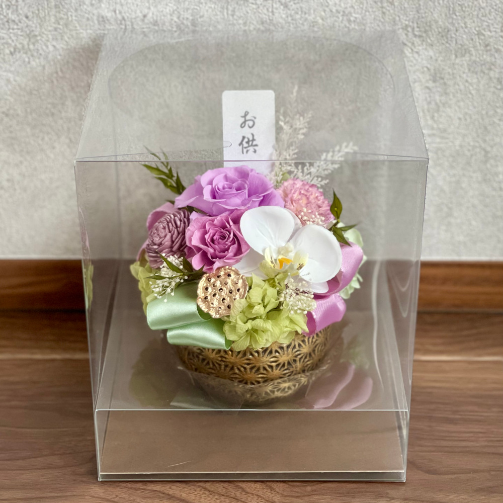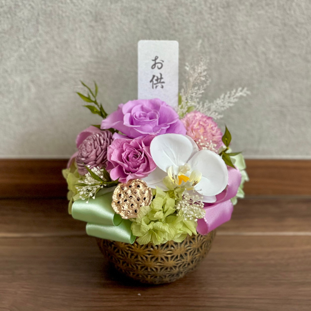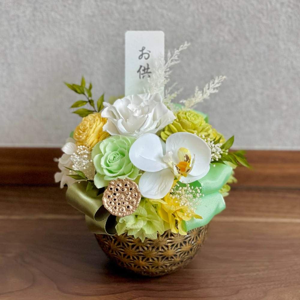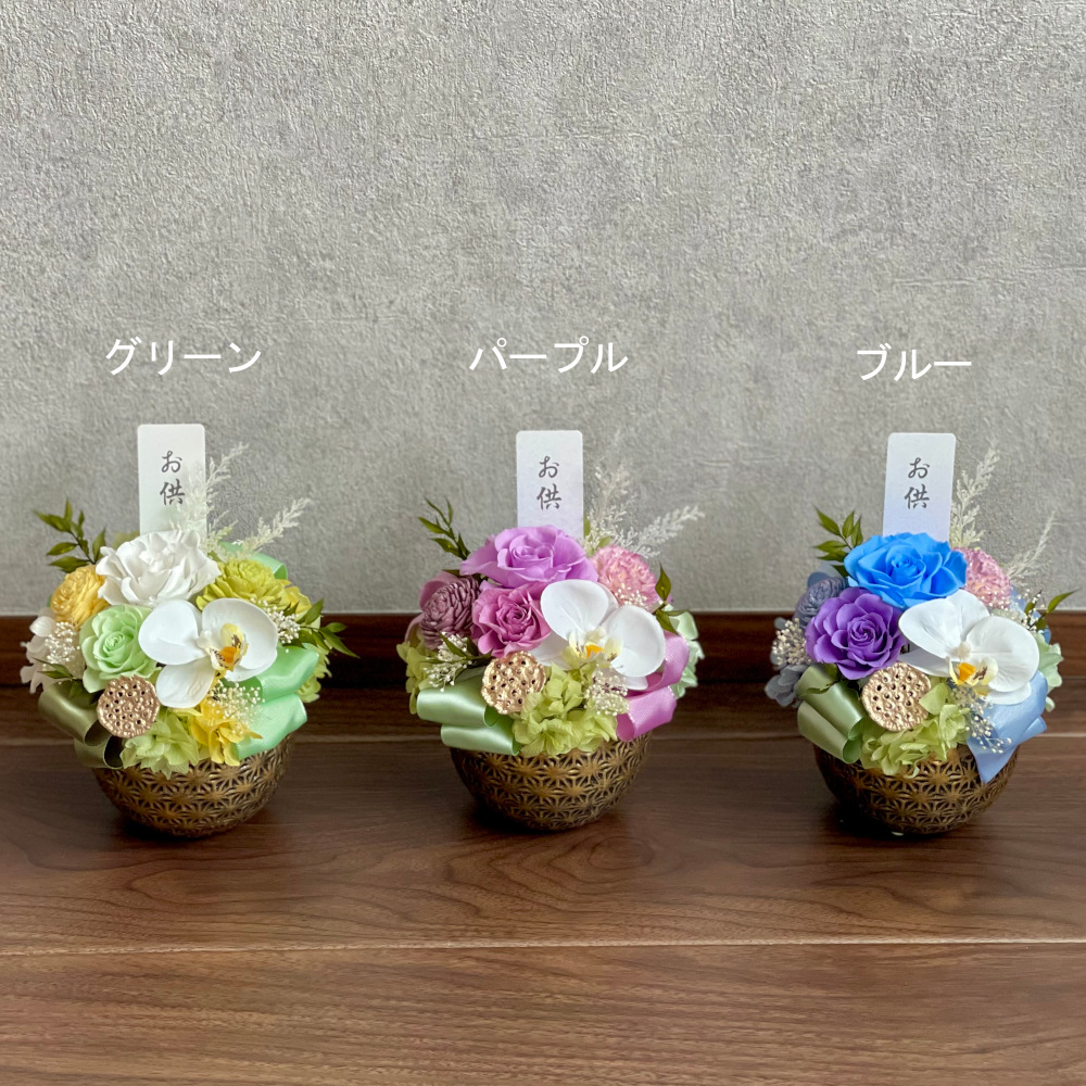 和風にも似合うデザインで仕上げたお供えの花。インテリアに馴染む、飾りやすい優しいデザインと、ミニ仏壇にも供えられるコンパクトサイズで仕上げました。お色はグリーン、パープル、ブルーの3種をご用意しました。プリザーブドフラワーを使い、お手入れ不要でずっと綺麗に保てます。※胡蝶蘭のみアーティフィシャルフラワー(高品質な造花)を使用しております。