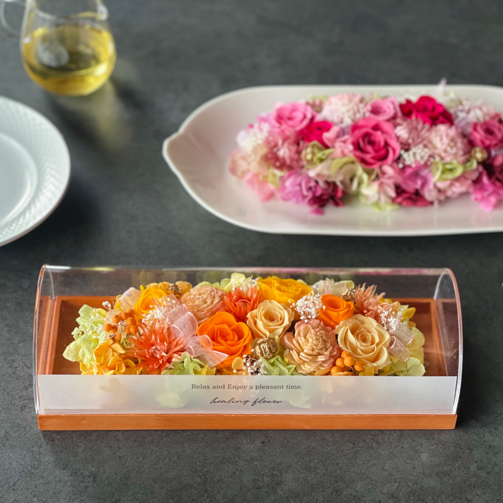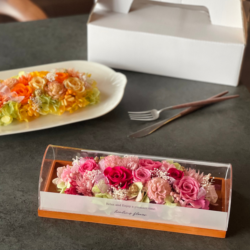 ケーキのように彩り鮮やかなアレンジをアクリル×天然木に閉じ込めました。
