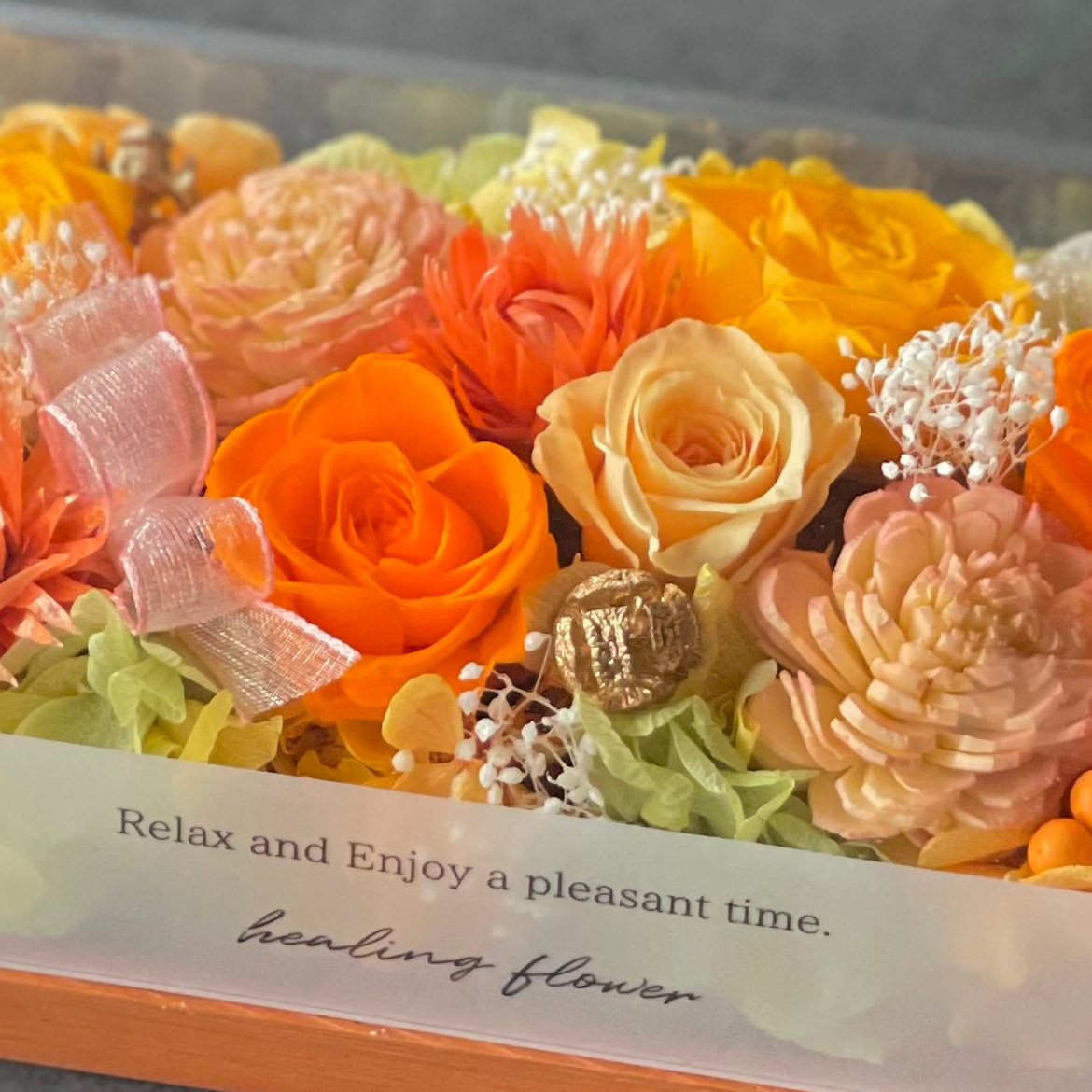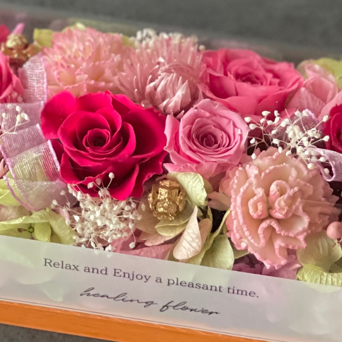 正方形のボックスにプリザーブドフラワーを敷き詰め、写真と一緒に飾れるお洒落なアイテム。
