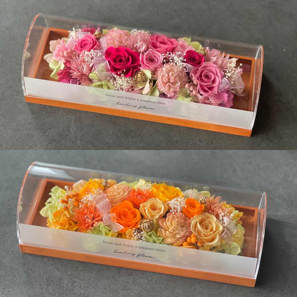 ケーキのように彩り鮮やかなアレンジをアクリル×天然木に閉じ込めました。可愛いローズのピンクorオレンジを濃淡で少し大人っぽく仕上げました。ケーキをデコレーションしたようなアレンジです。まるでスイーツのような佇まいは、誕生日や結婚記念日のお祝いやプレゼントに最適。ケーキボックス付き。