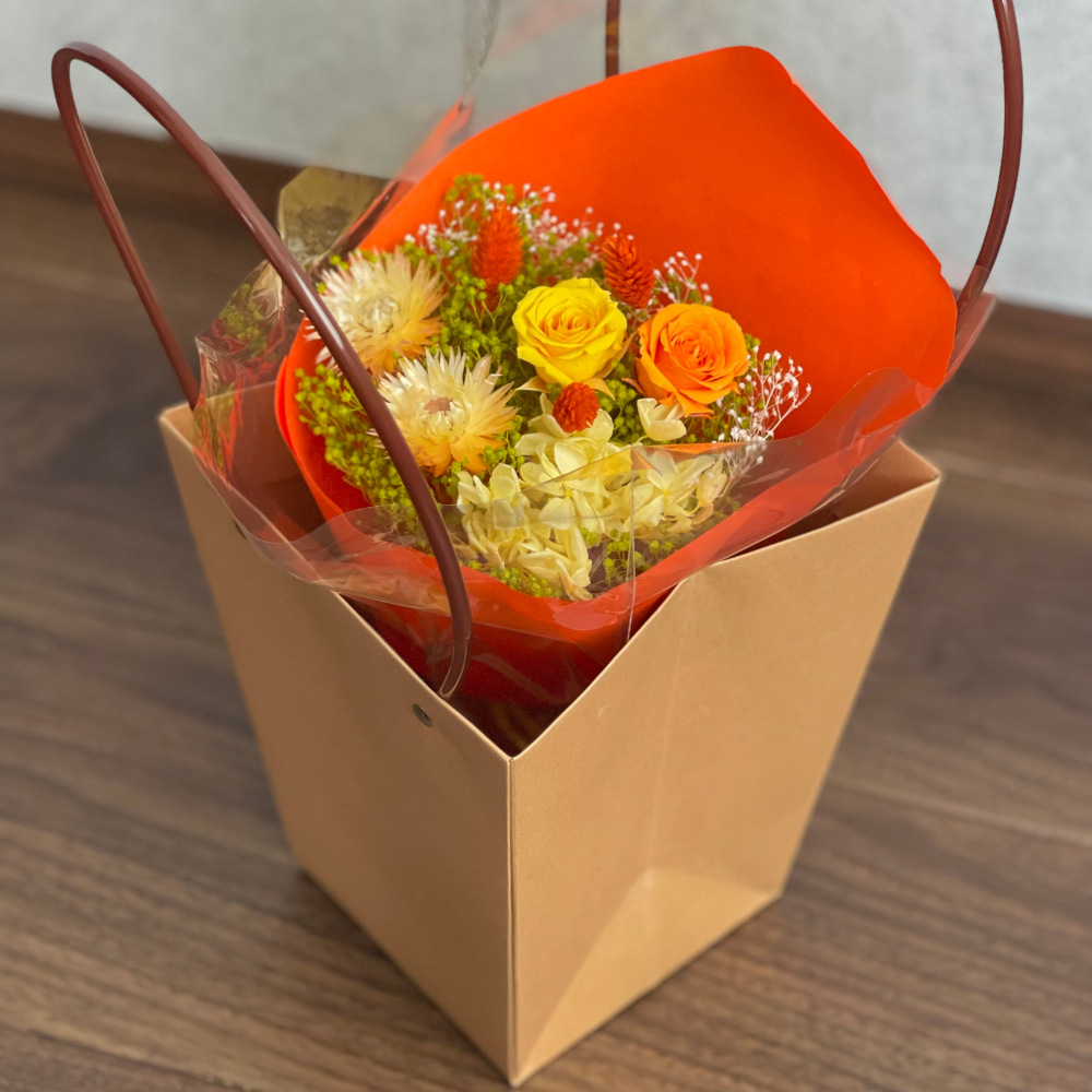 ハッピーな気分になれるように可愛くアレンジしたハッピーブーケ。お祝い、お礼などにパッと華やかなプリザーブドフラワーの花束はいかがですか。そのまま飾っても、生花のように花びんに立ててもお水いらずで、いつまでもきれいなプリザーブドフラワーのブーケです。バッグ付きなのでそのまま飾ったりプレゼントにもおすすめ。