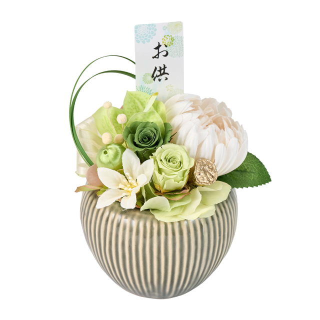 今までにはない和風イメージのころんとしたデザインに仕上げたお供えの仏花。フューネルアレンジらしく落ち着いた色合いに仕上げました。お悔やみのお花としてお仏壇に彩を添えたいそんな気持ちに寄り添うお花です。