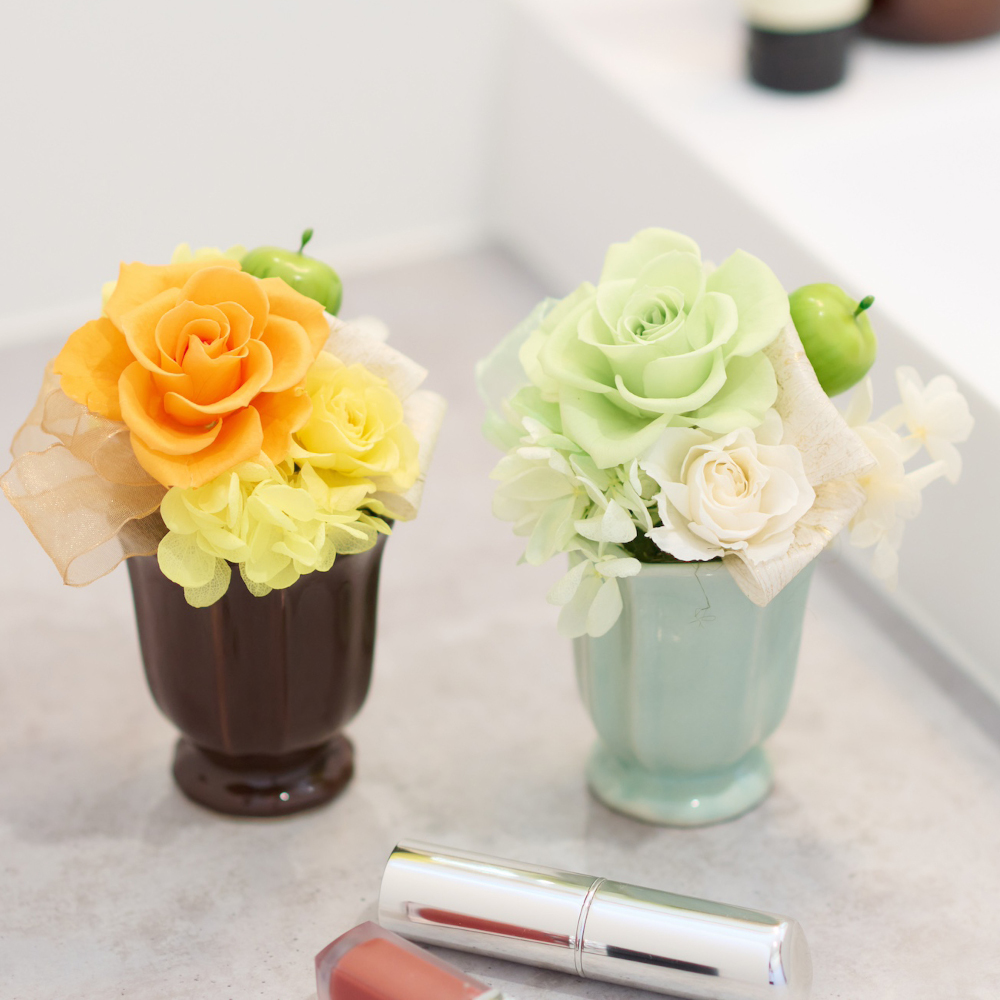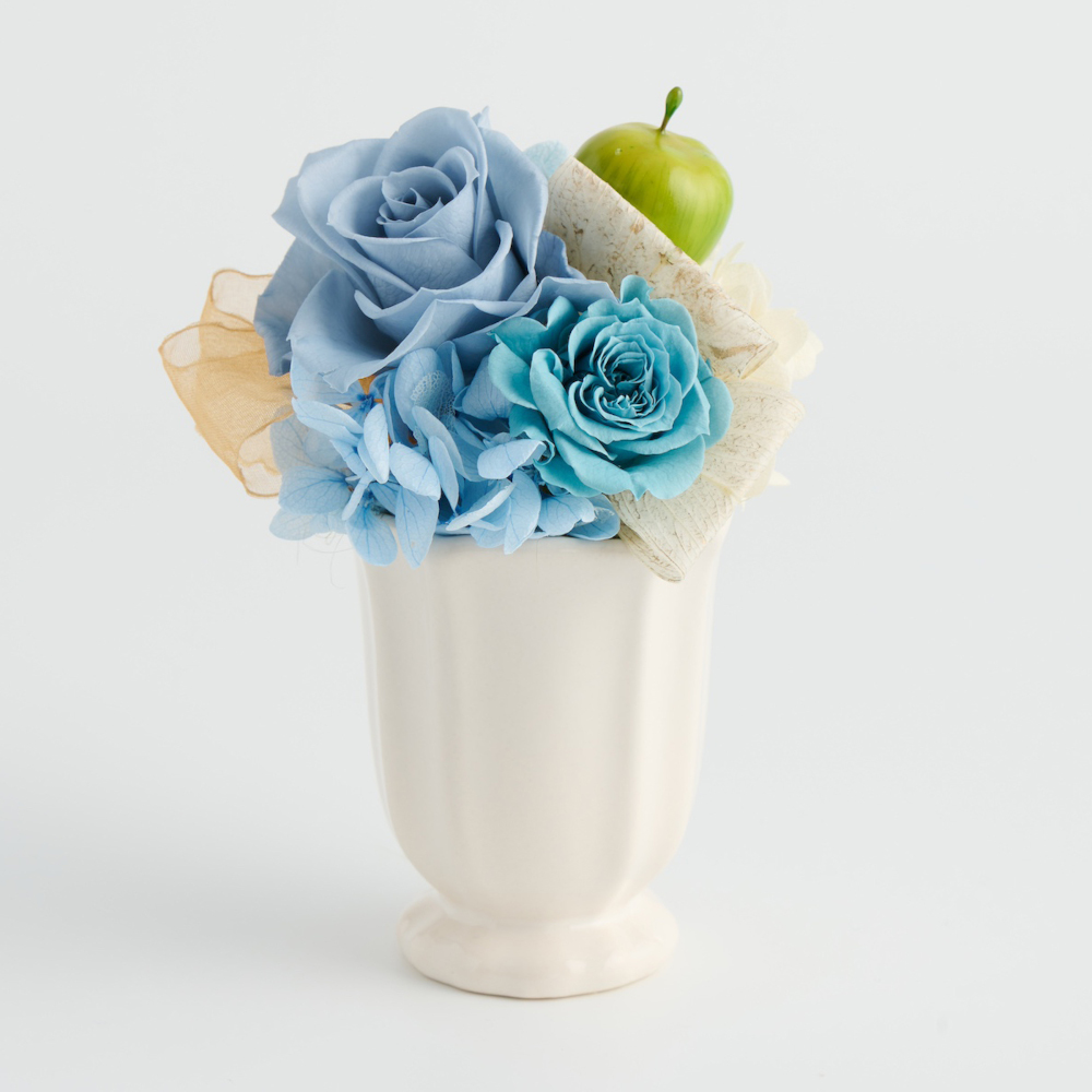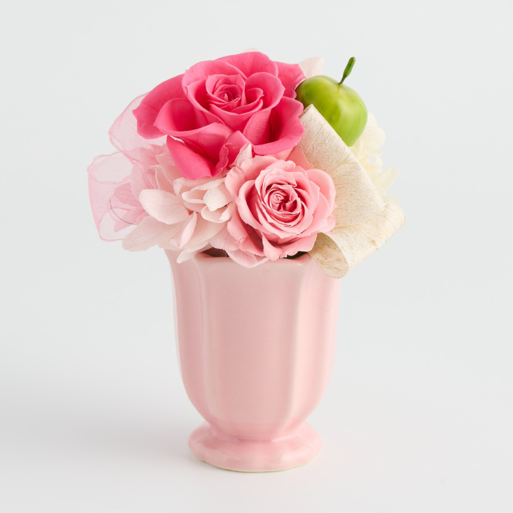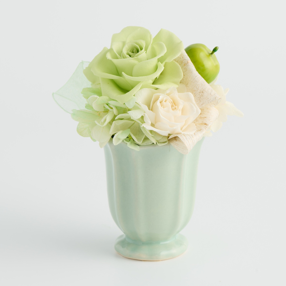 プリザーブドフラワーと可愛いホワイト花器を組み合わせたアレンジメント。
