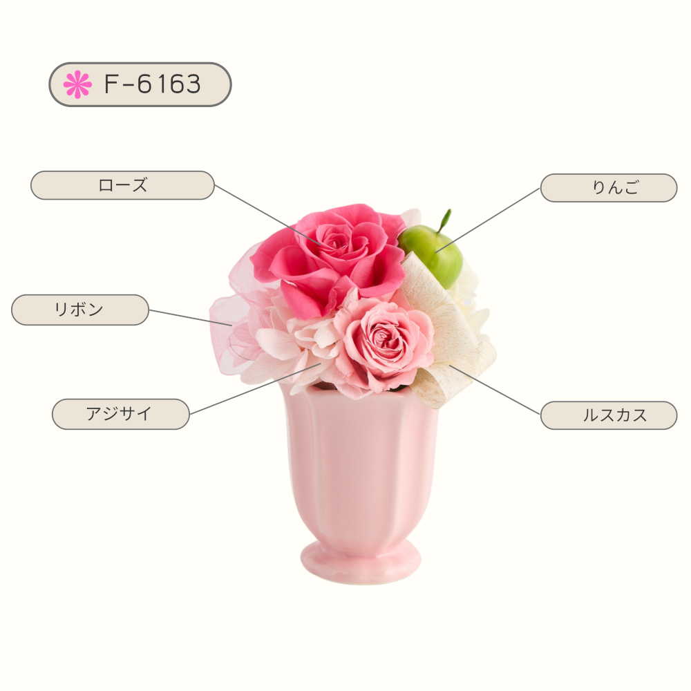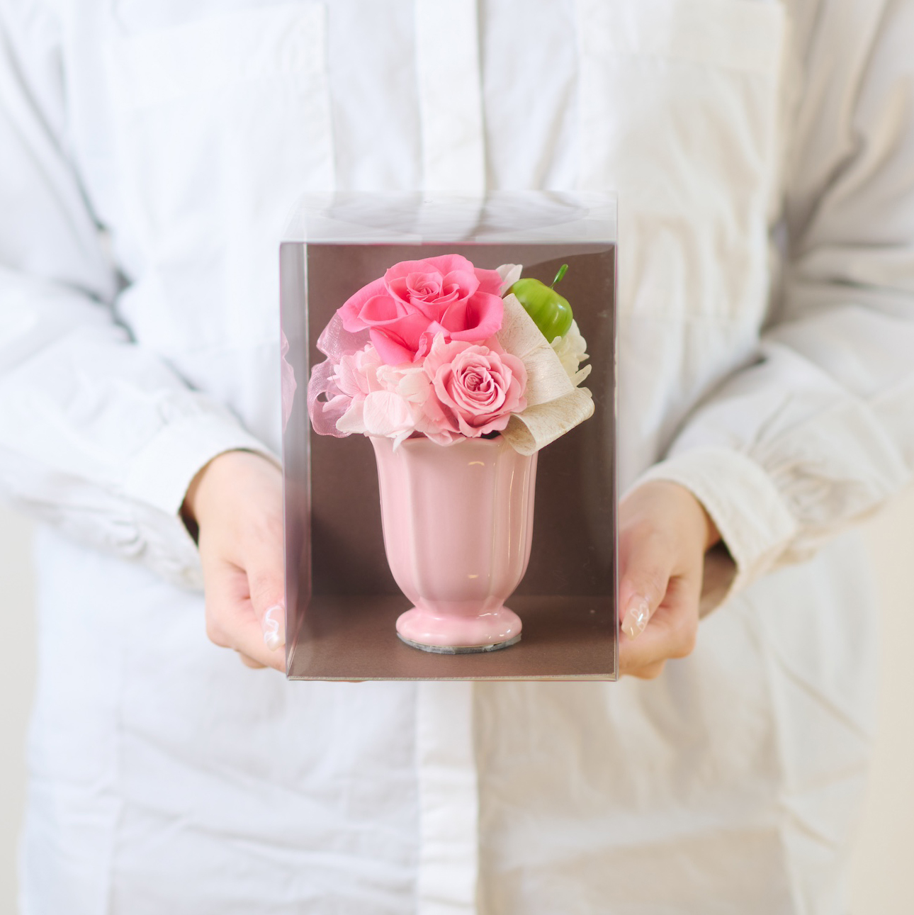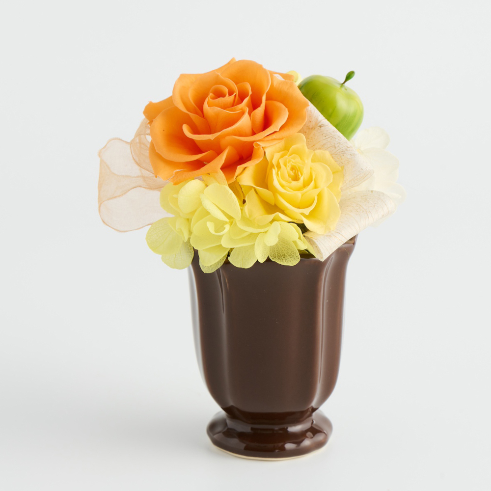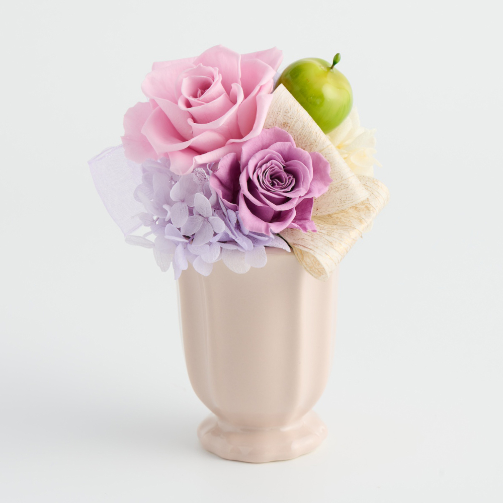 プリザーブドフラワーと可愛いホワイト花器を組み合わせたアレンジメント。