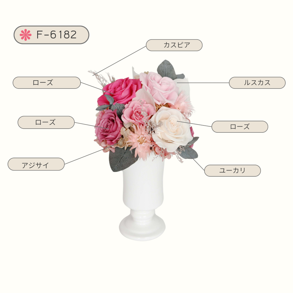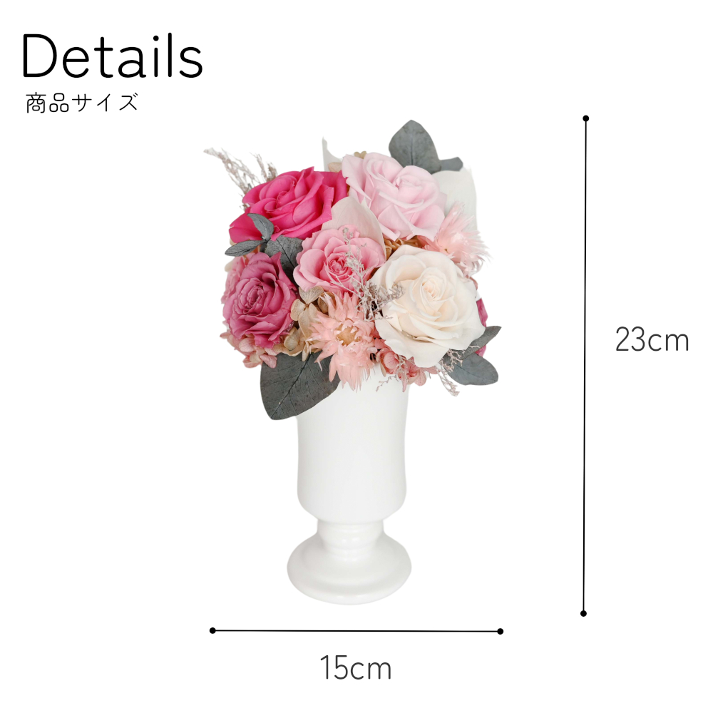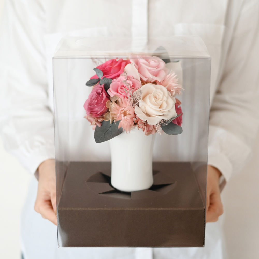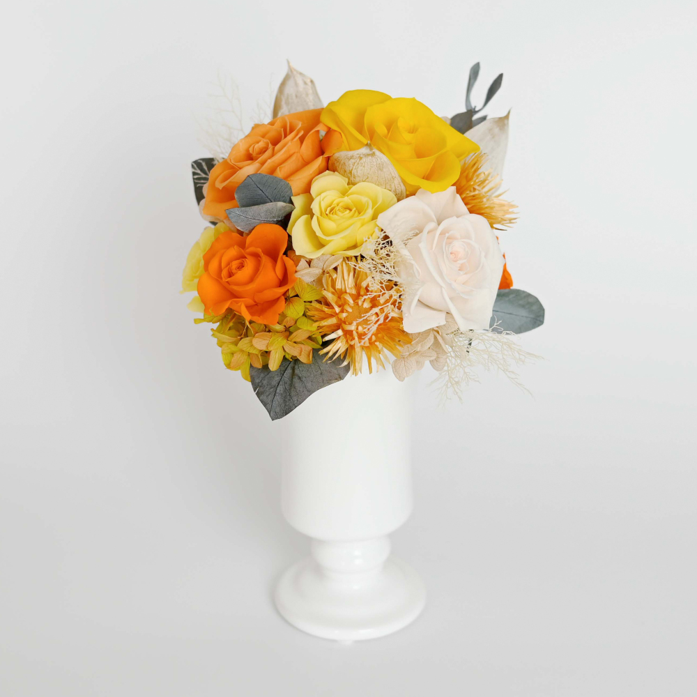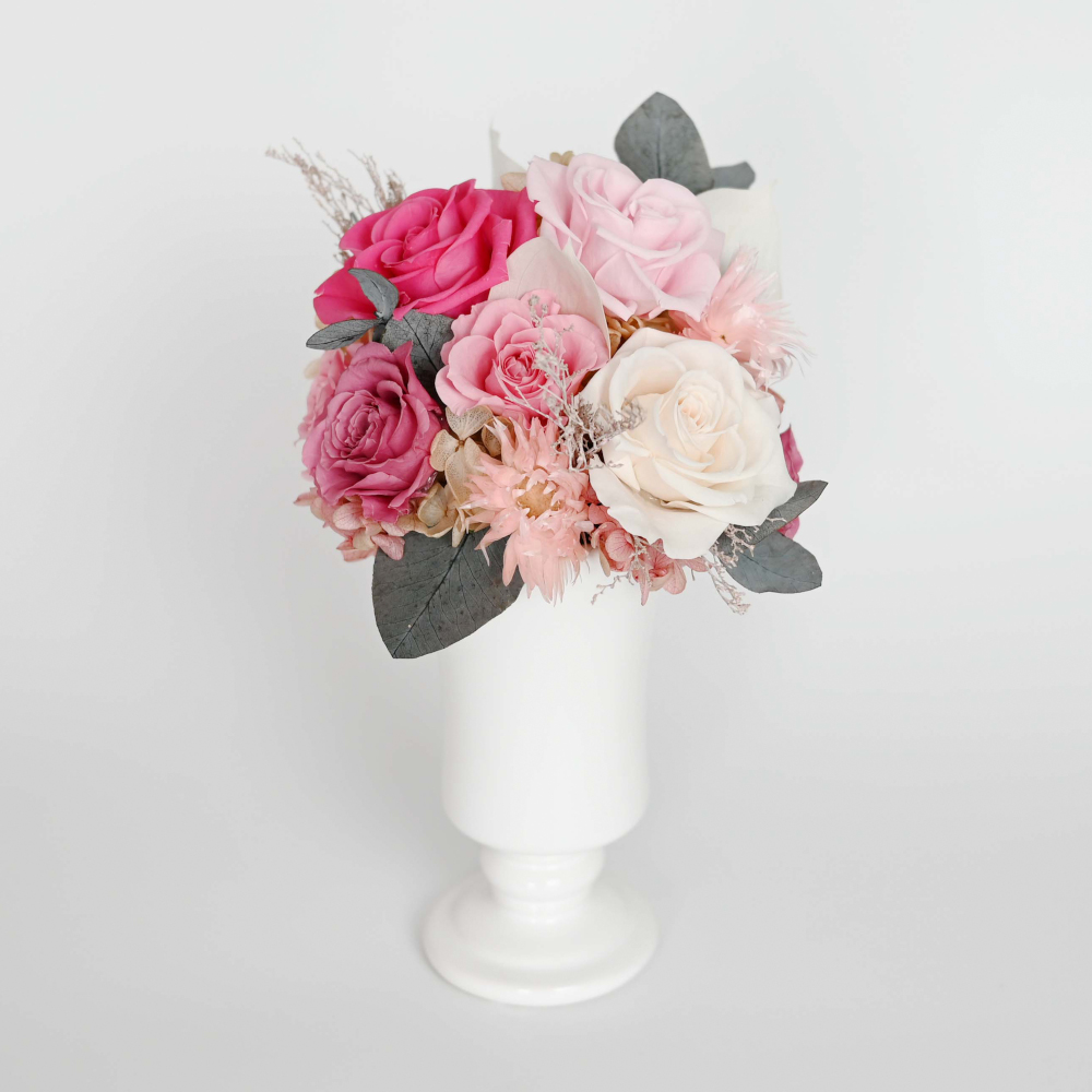 プリザーブドフラワーと可愛いホワイト花器を組み合わせたアレンジメント。