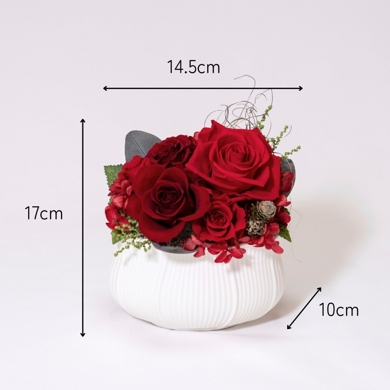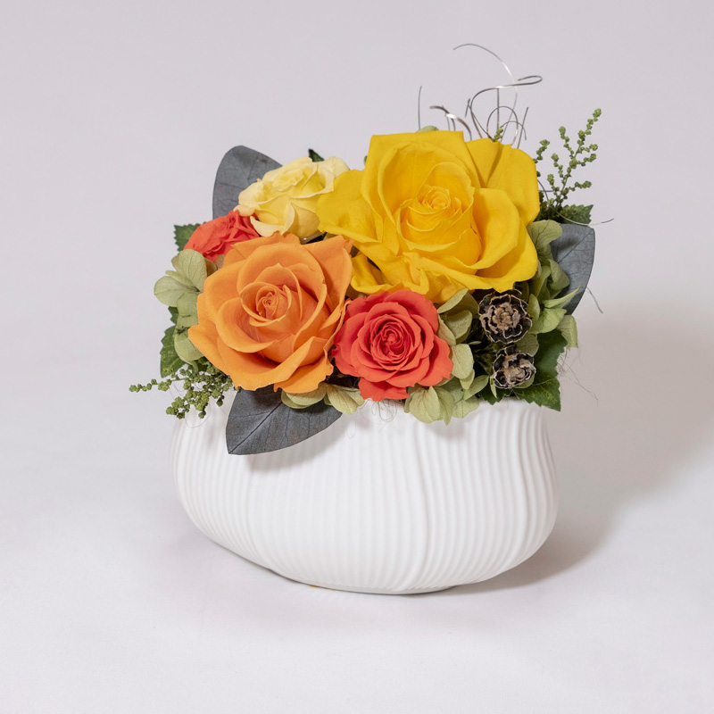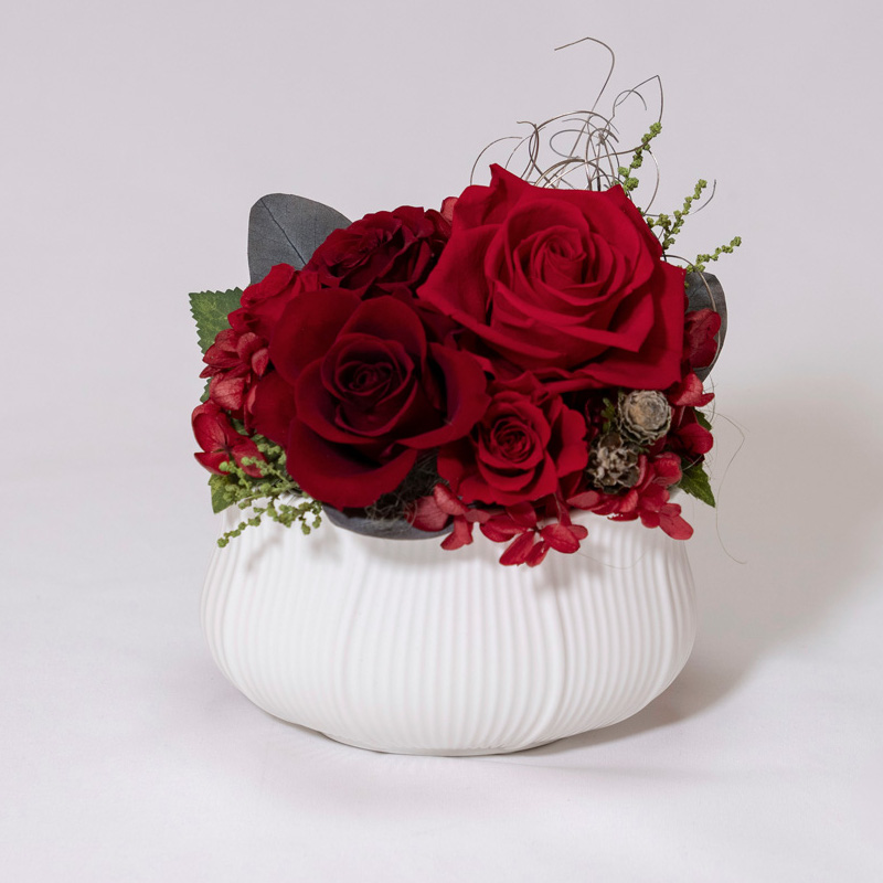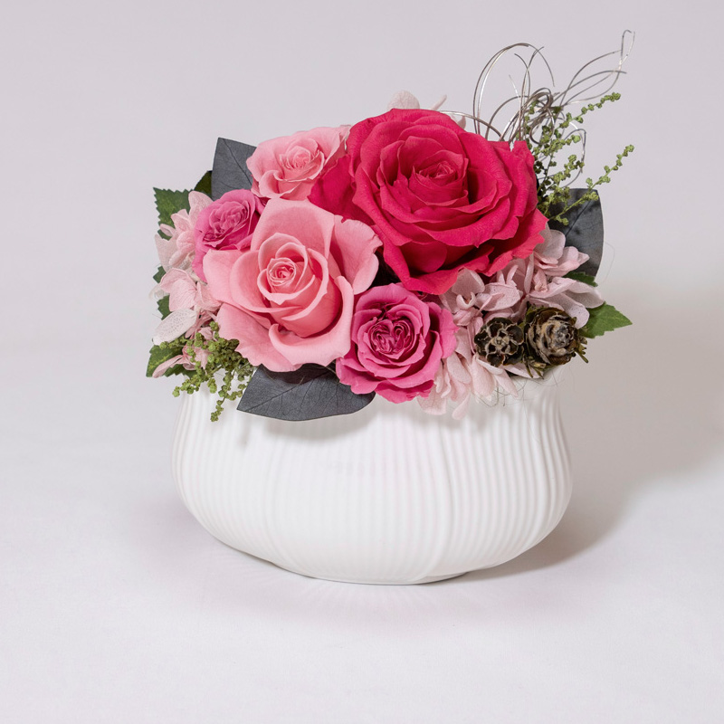 プリザーブドフラワーと可愛いホワイト花器を組み合わせたアレンジメント。