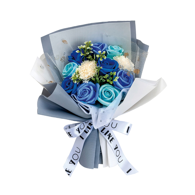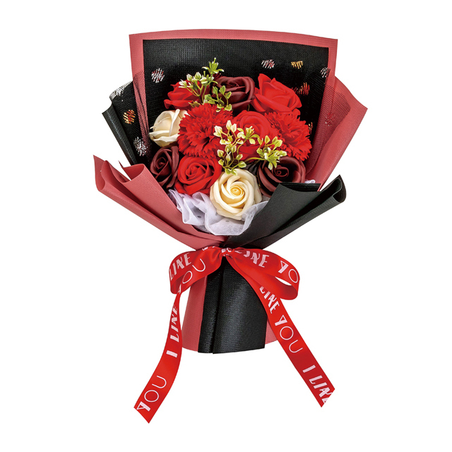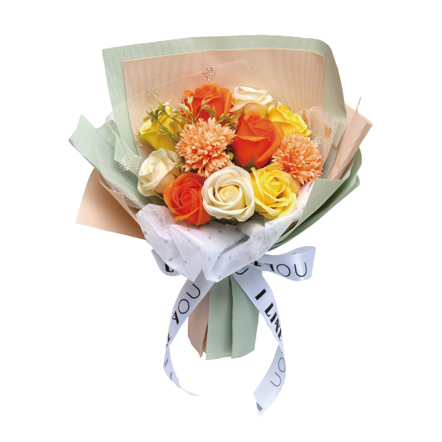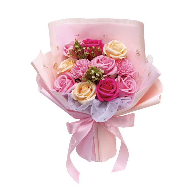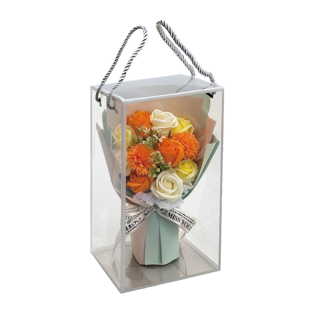 ソープフラワーを使ったボリューム感のある花束。ラッピングされているのでそのまま気軽にインテリアの飾りとしてお使いいただけます。手さげ付クリアケースに入っているのでプレゼントにも喜ばれます。花びら1枚1枚がせっけんの素材で出来た観賞用のお花です。
