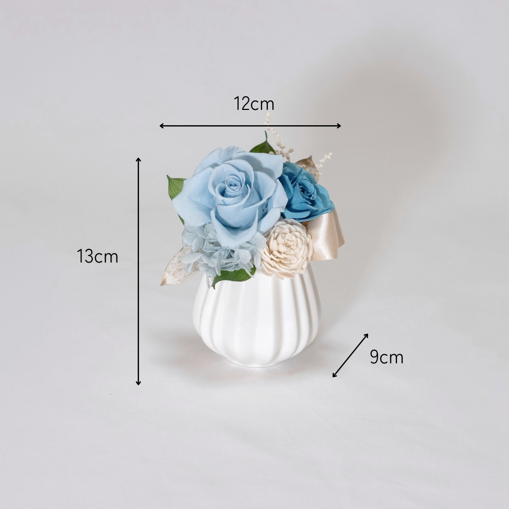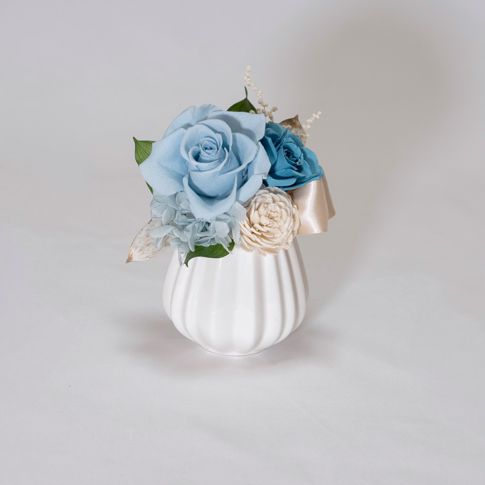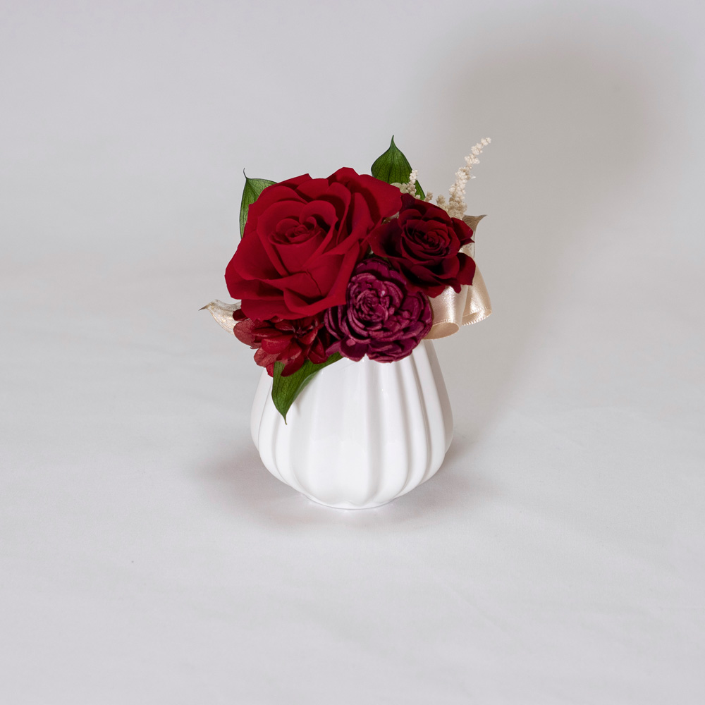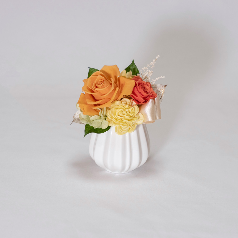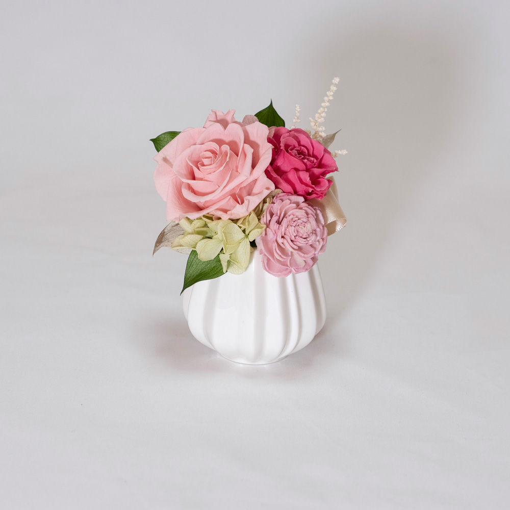 プリザーブドフラワーと可愛いホワイト花器を組み合わせたアレンジメント。