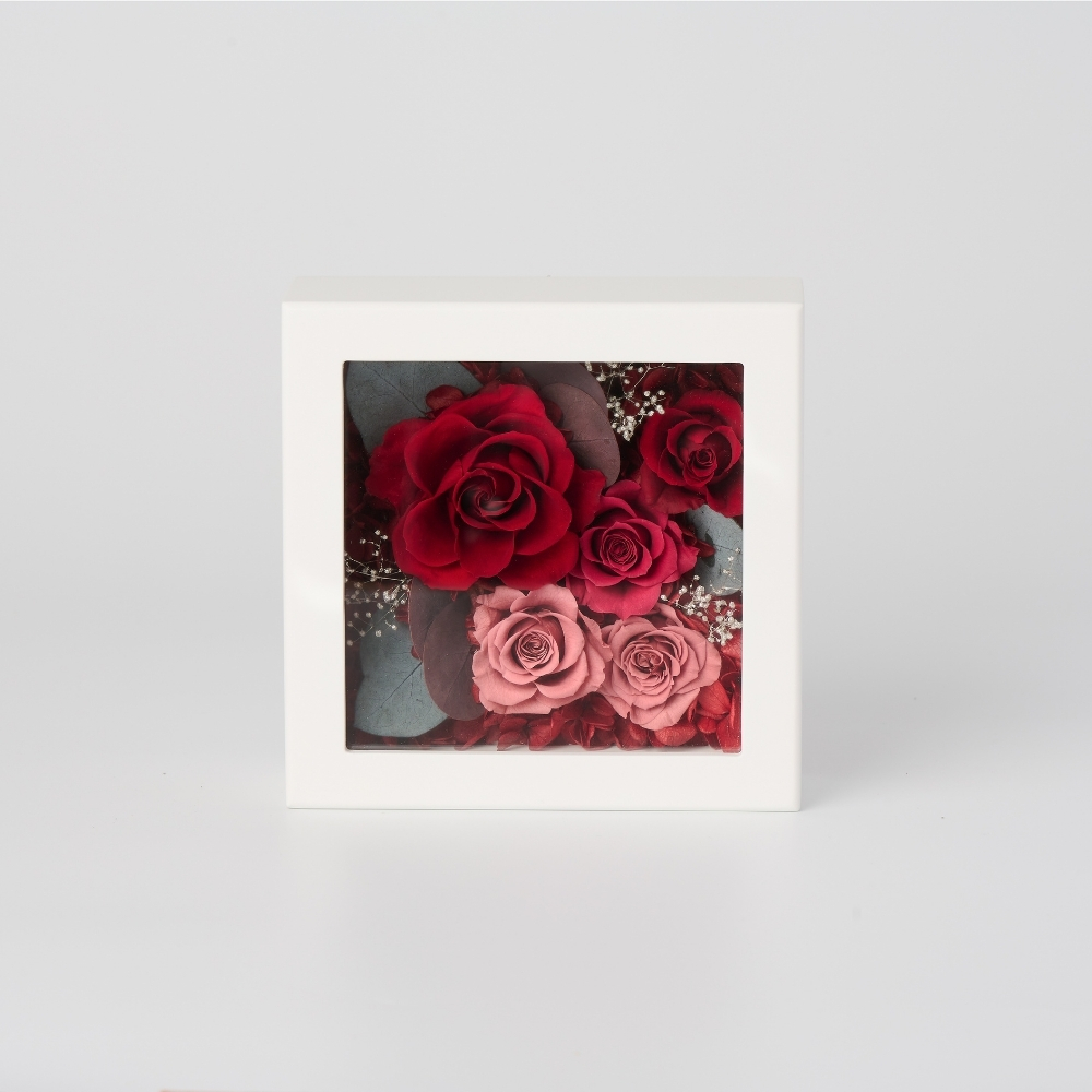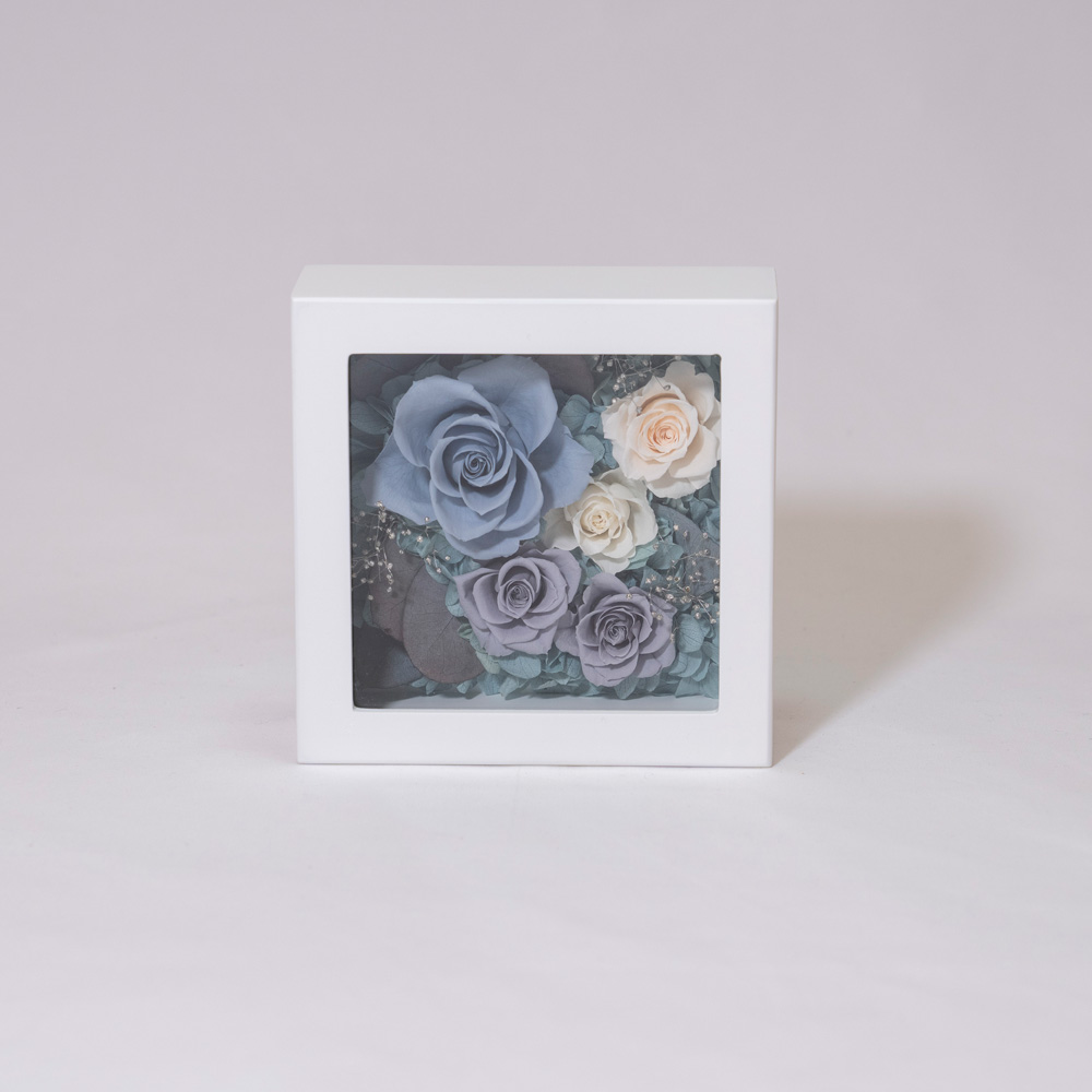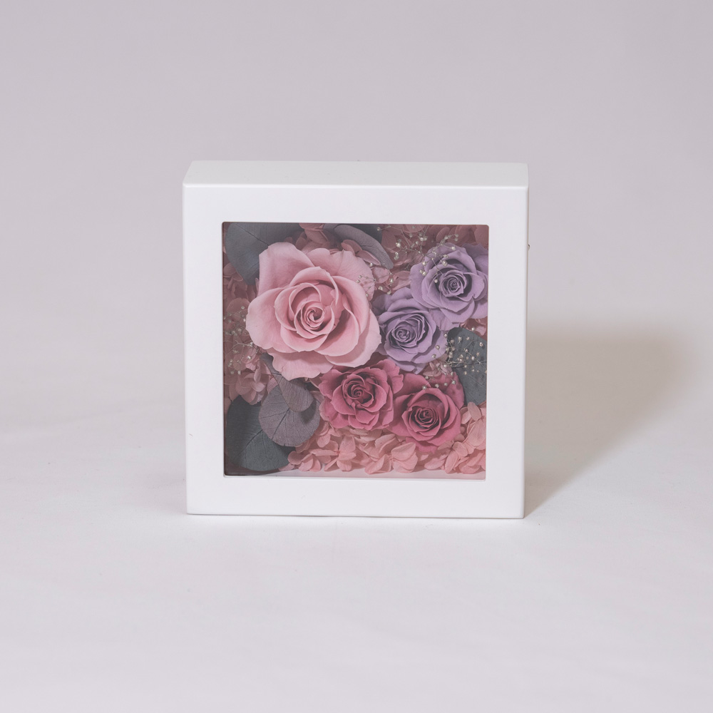 正方形のボックスにプリザーブドフラワーを敷き詰め、写真と一緒に飾れるお洒落なアイテム。