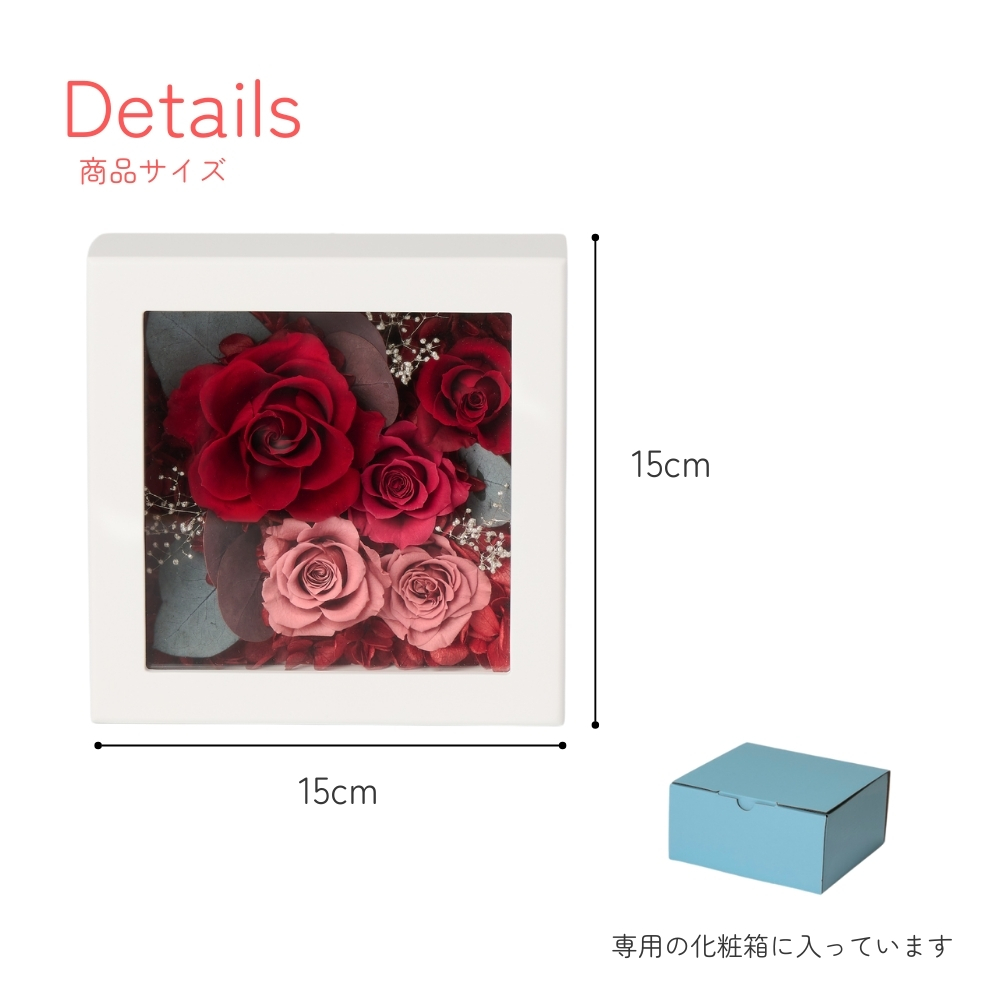 シンプルな15cm角のフレームに、立体的にバラをアレンジ。贈る方のイメージに合わせて選べる全3色のアレンジメント。プリザーブドフラワーをふんだんに使った豪華でおしゃれなアイテムです。自立して飾ることはもちろん、壁掛けもできるので幅広くギフトとして活躍します。