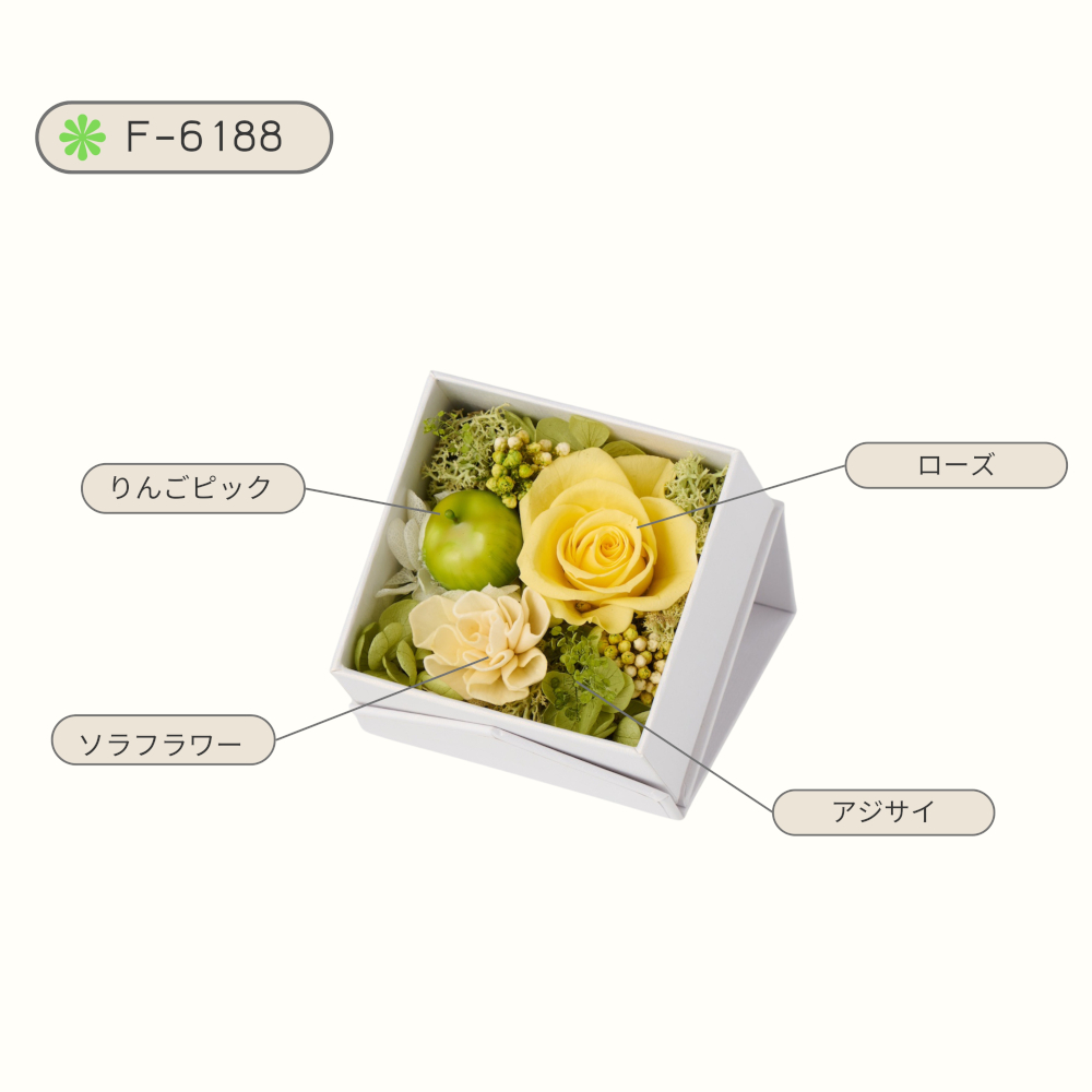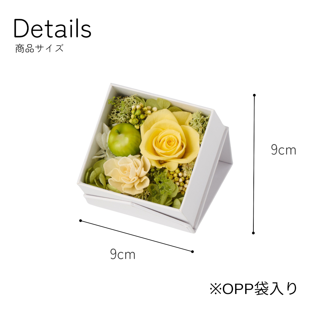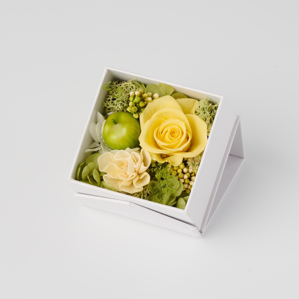 青りんごをアクセントにした爽やかなプリザーブドアレンジメント。正方形のボックスにローズやアジアイ、ソラフラワーなどを可愛くアレンジしました。インテリアにも馴染むアレンジメントはディスプレイにも最適。持ち運びやすいコンパクトサイズなので様々なギフトにも適しています。