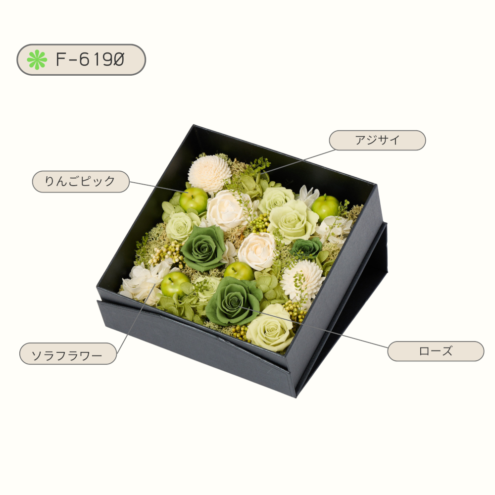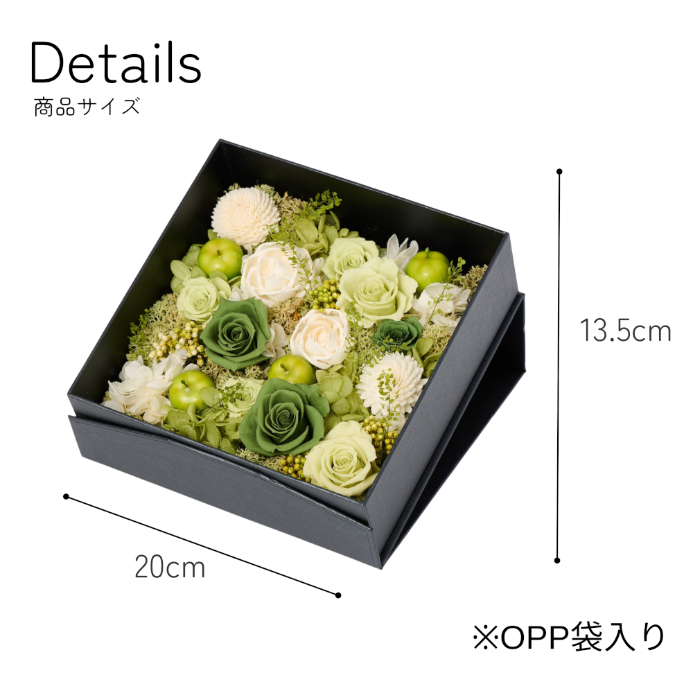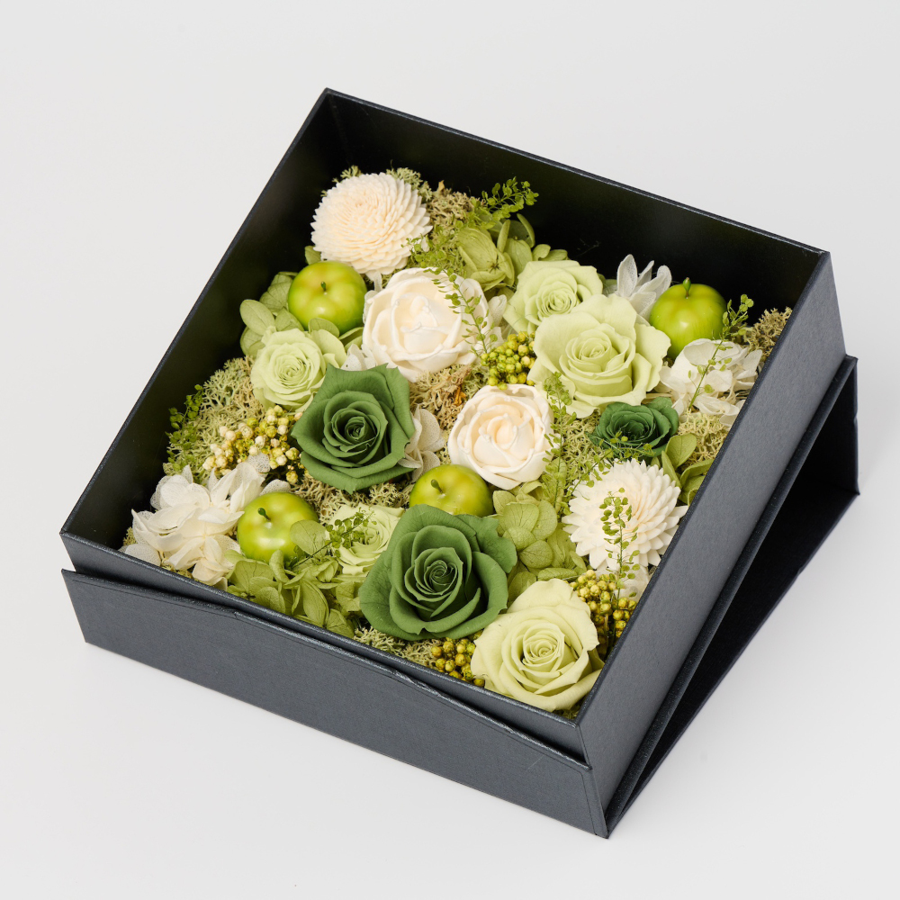 青りんごをアクセントにした爽やかなプリザーブドアレンジメント。正方形の大きなボックスにローズやアジアイ、ソラフラワーなどを可愛くアレンジしました。インテリアにも馴染むアレンジメントはディスプレイにも最適。持ち運びやすいコンパクトサイズなので様々なギフトにも適しています。