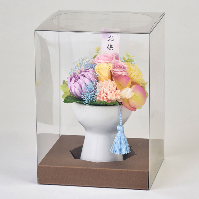 人気の色合いでデザインしたプリザーブドフラワーのアレンジメントです。お花の高さを抑えることでお供えしやすいアレンジに仕上げました。お悔みの花として長くお供えできるアレンジは、故人を偲ぶさまざまなシーンでお使い頂けます。クリアケース入り。