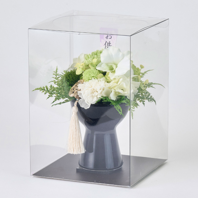 淡いグリーンとホワイトでコーディネートした爽やかなプリザーブドフラワーのアレンジメントです。ブラックの花器が重厚感があり落ち着いた印象を与えてくれます。お悔みの花として長くお供えできるアレンジは、故人を偲ぶさまざまなシーンでお使い頂けます。クリアケース入り。
