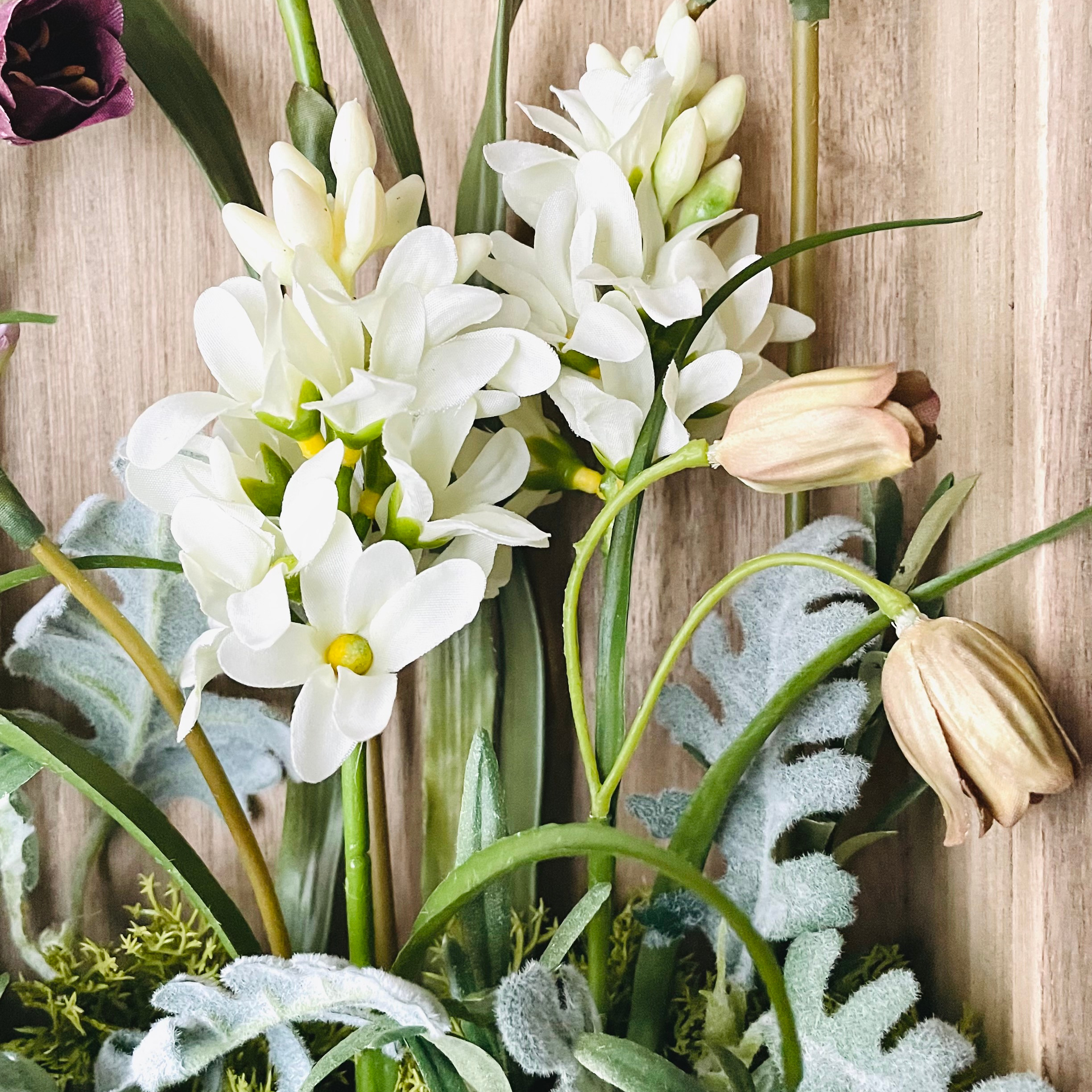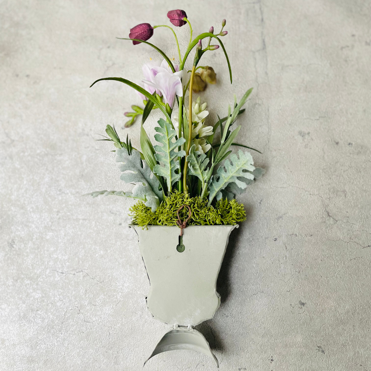 花器デザインの壁掛けです。インテリアにヒヤシンス、フリージア、フラチラリアをナチュラルテイストにアレンジ。適度なサイズ感のアレンジは玄関やリビング、カフェなどのインテリアにおすすめです。