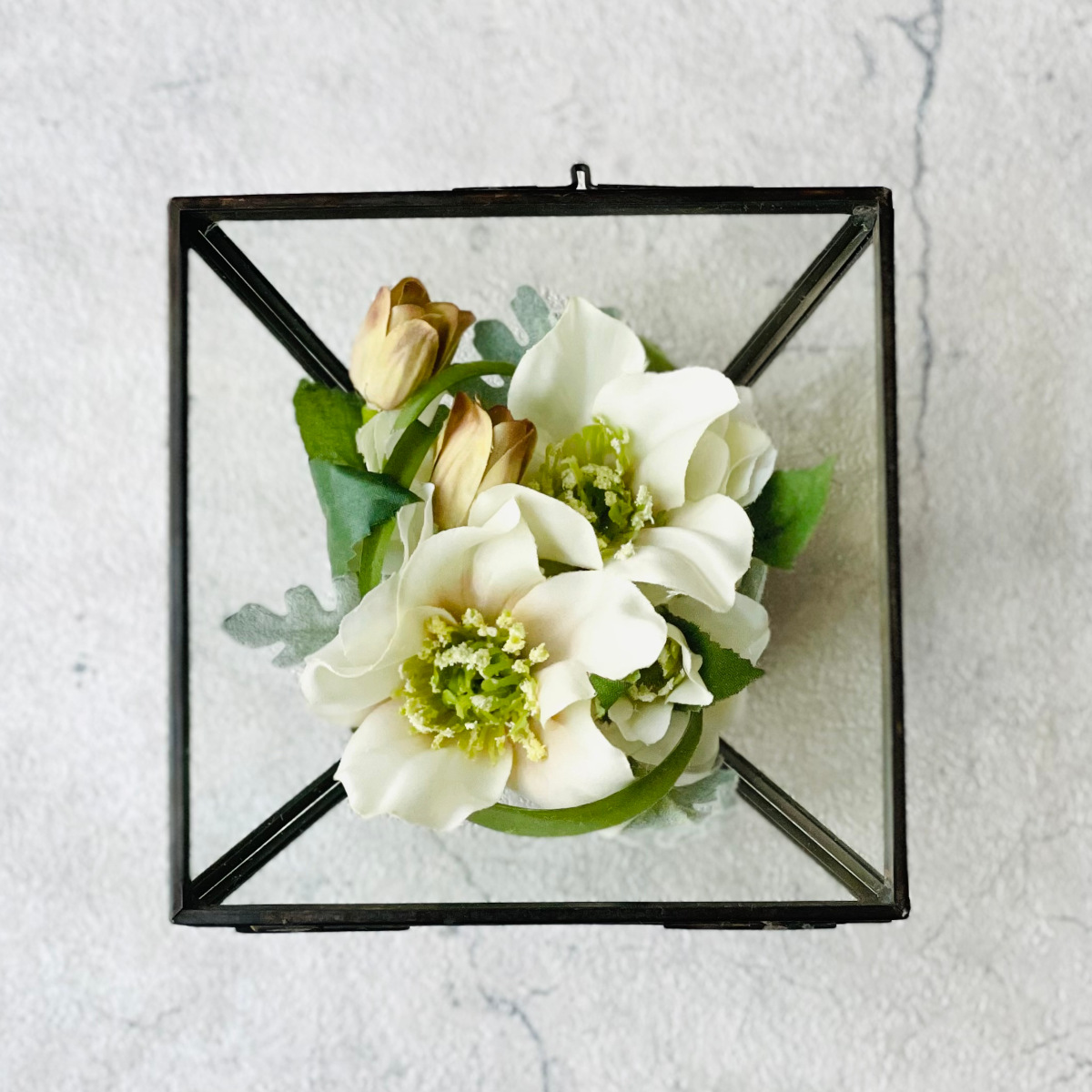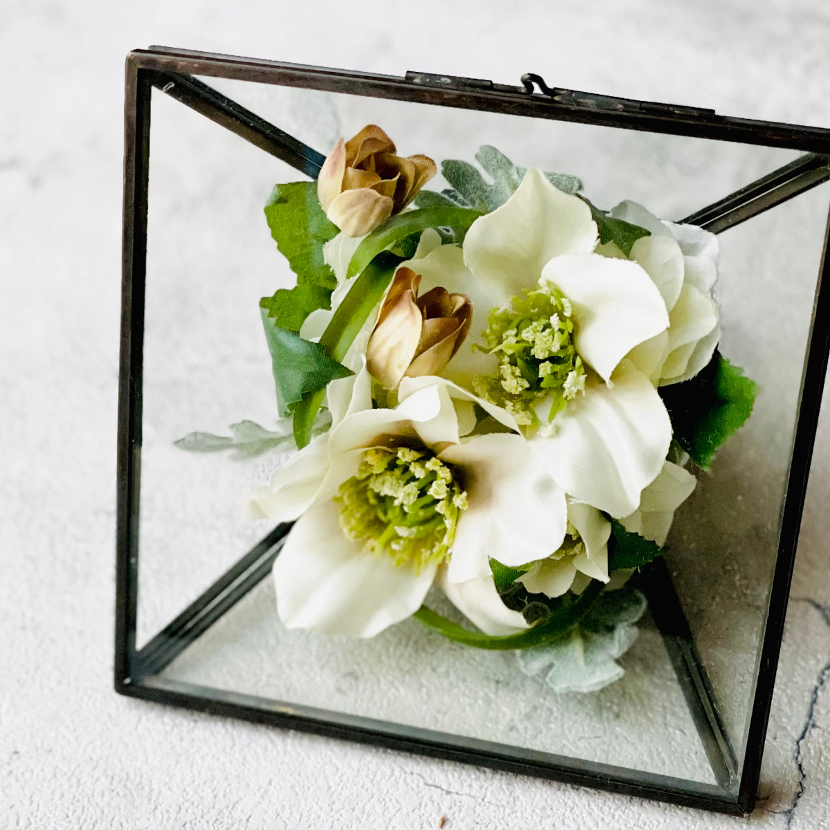 アンティーク調のガラスケースにクリスマスローズやフラリチリアアレンジしました。アーティフィシャルフラワーなので長く楽しんでいただけます。シンプルなオフホワイトのお花なのでウエディングにもおすすめです。新築祝い、お祝い、ギフト、自分へのご褒美に。