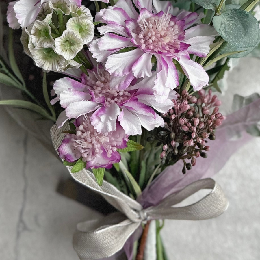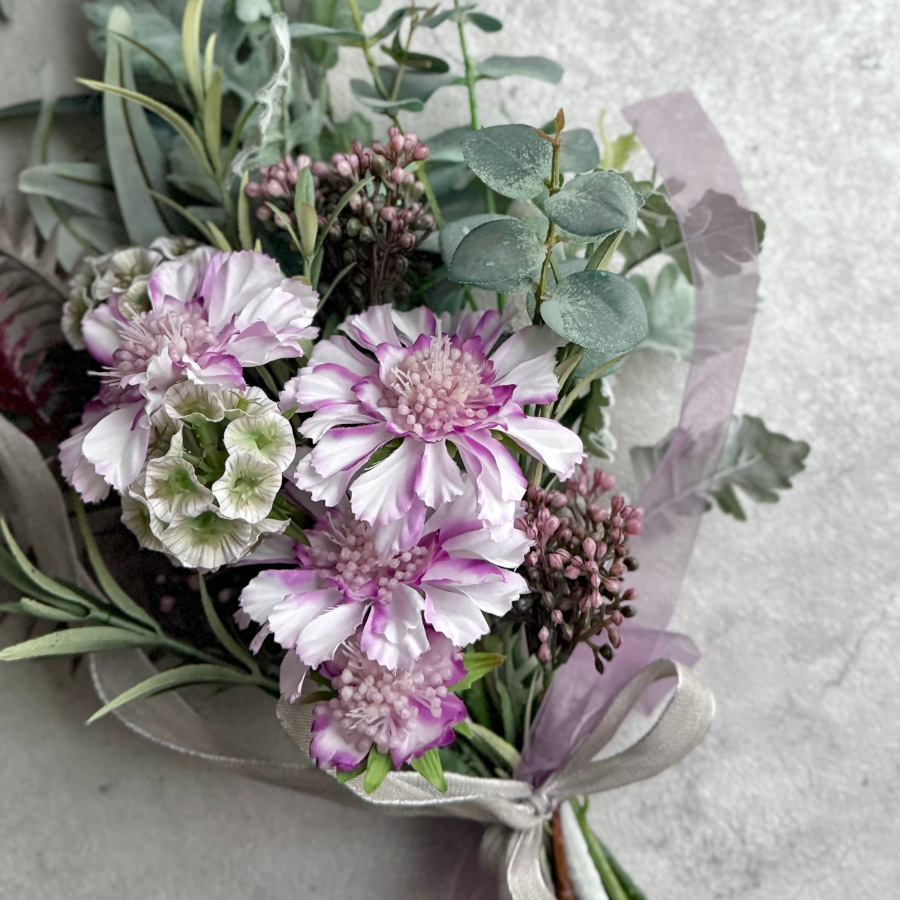 スカビオサとユーカリが絶妙に組み合わされ、シックで上品な雰囲気を演出しています。