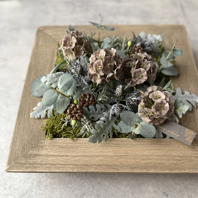 アーティフィシャルフラワーのスカビオサを使った落ち着いた雰囲気のフレームアレンジです。ナチュラルな庭をぎゅっと詰め込んだ雰囲気に仕上げました。フレームなので壁にかけてもらったり、置いて飾ってもらうこともできます。玄関やリビング、カフェなどのインテリアにおすすめです。