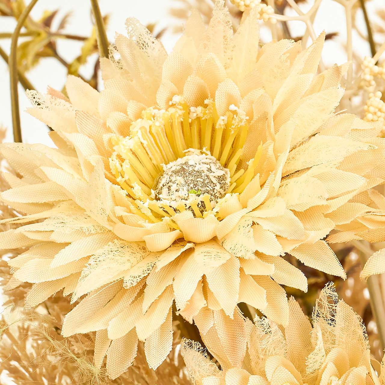 ベージュ/イエローのマルグリーミックスブーケ アーティフィシャルフラワー 造花。花径約6cmのベージュカラーのマム(キク)が2輪、約7cmのマム(キク)が2輪、ポアプランツや色々なグリーンをミックスしたブーケです。