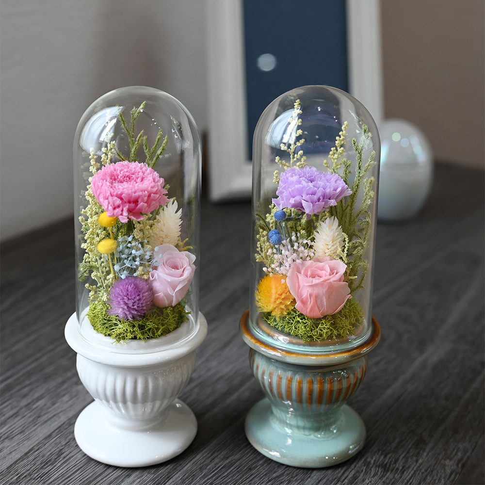 透明感のあるガラスシリンダーに閉じ込められたプリザーブドフラワーは、高級感がありながらお手入れが不要なため、ギフトとしても非常に人気が高いアイテムです。