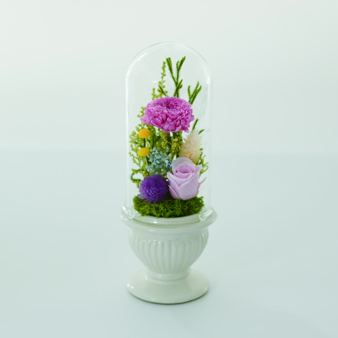 透明感のあるガラスシリンダーに閉じ込められたプリザーブドフラワーは、高級感がありながらお手入れが不要なため、ギフトとしても非常に人気が高いアイテムです。