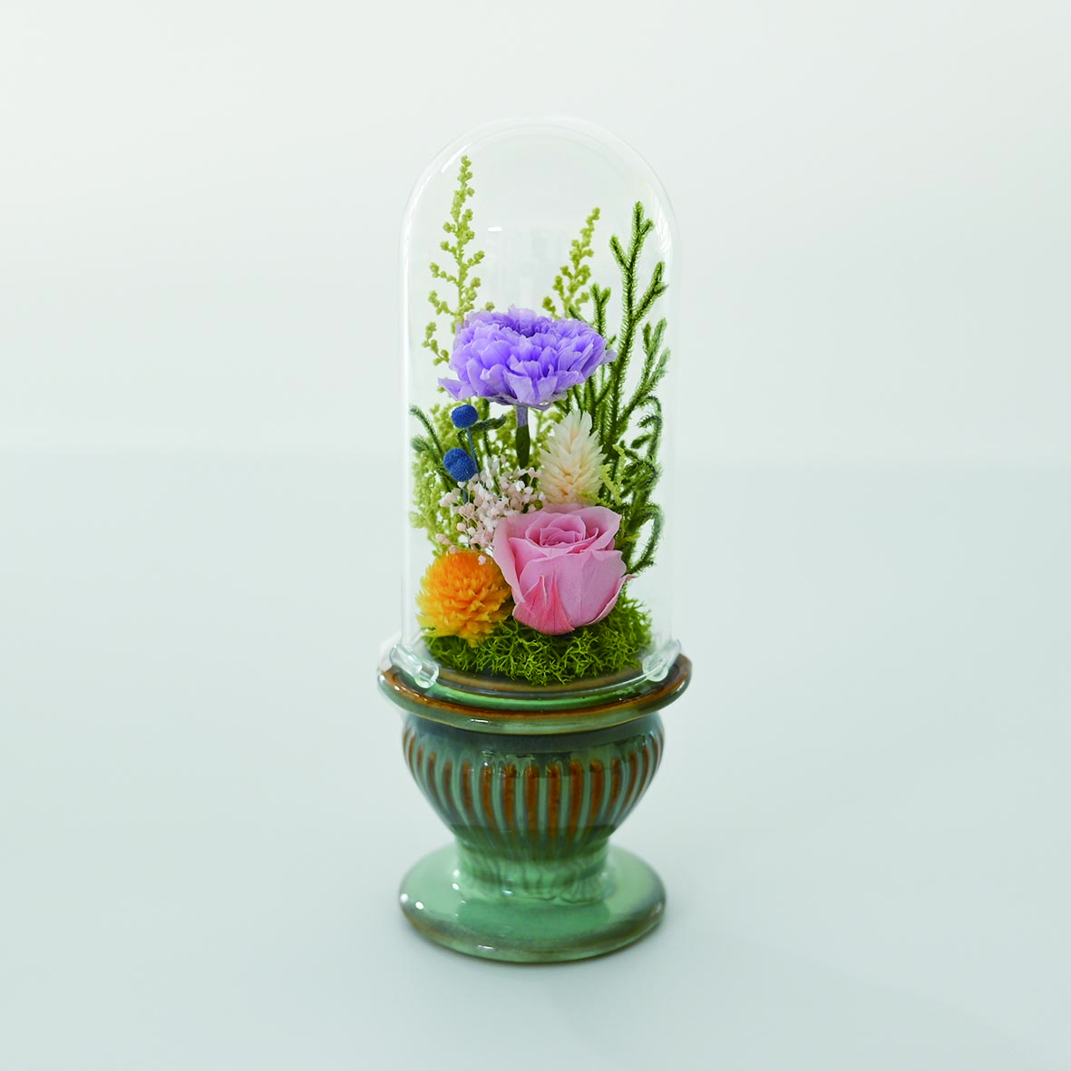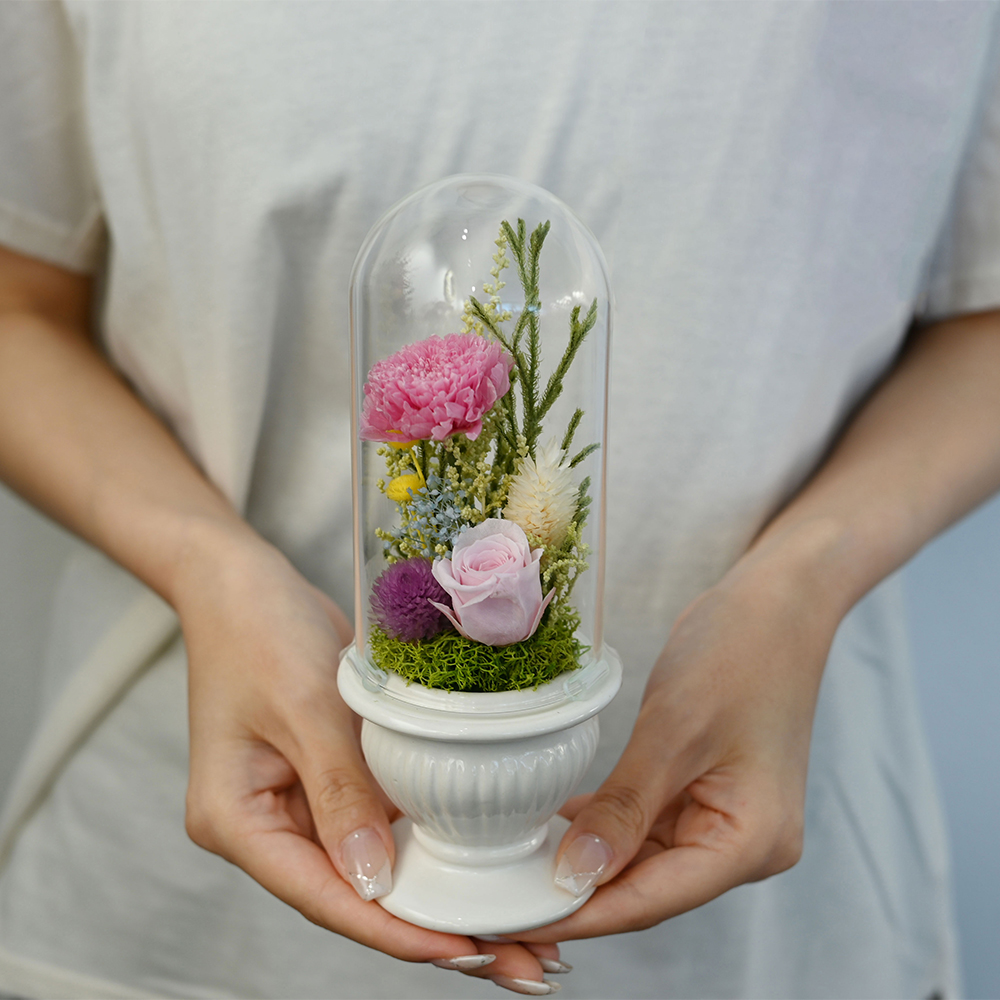 埃から守るガラスドーム入り。水やり不要で、大切な場所を優しく彩る本格派プリザーブドフラワー。