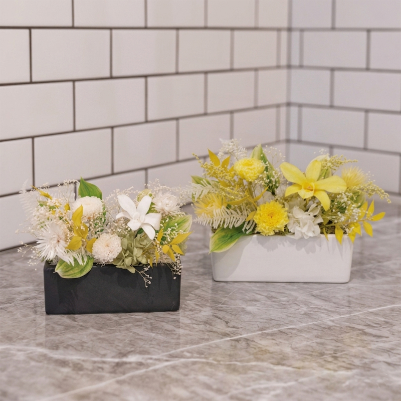 白と黄を基調とした、清楚で品格のあるカラーリング。伝統的な仏花の良さを残しつつ、洋室のインテリアや現代仏壇にも美しく馴染む横型(長方形)のモダンなデザインが特徴です。